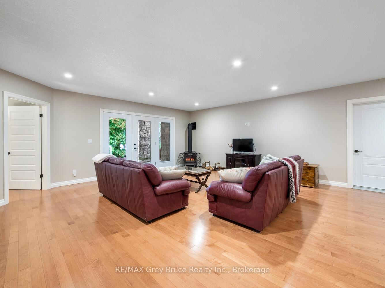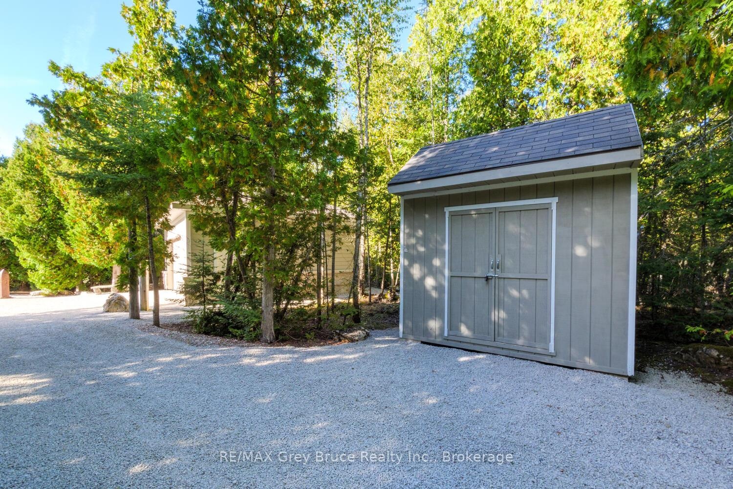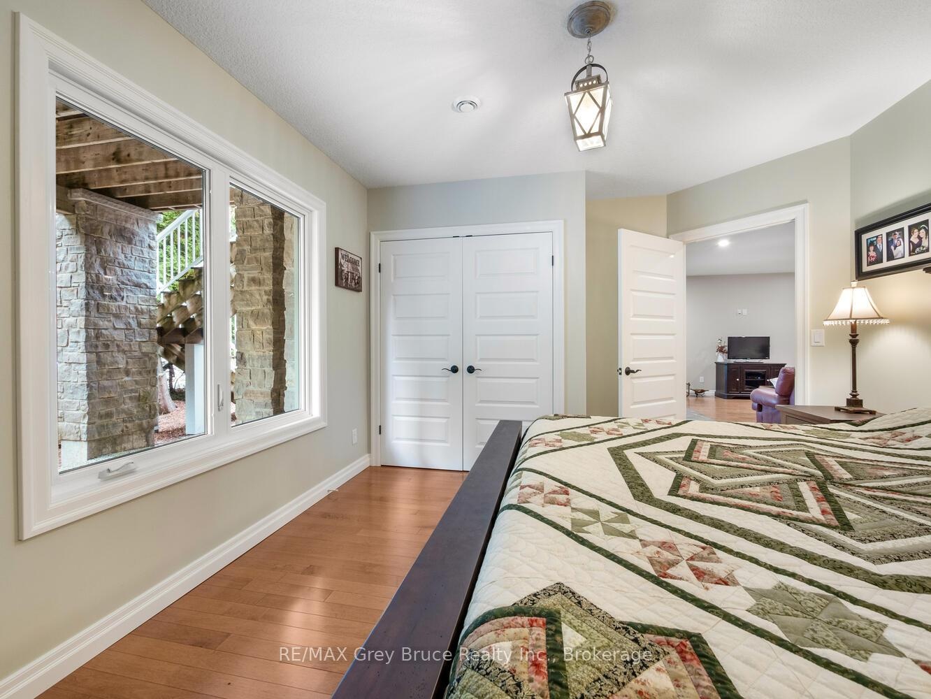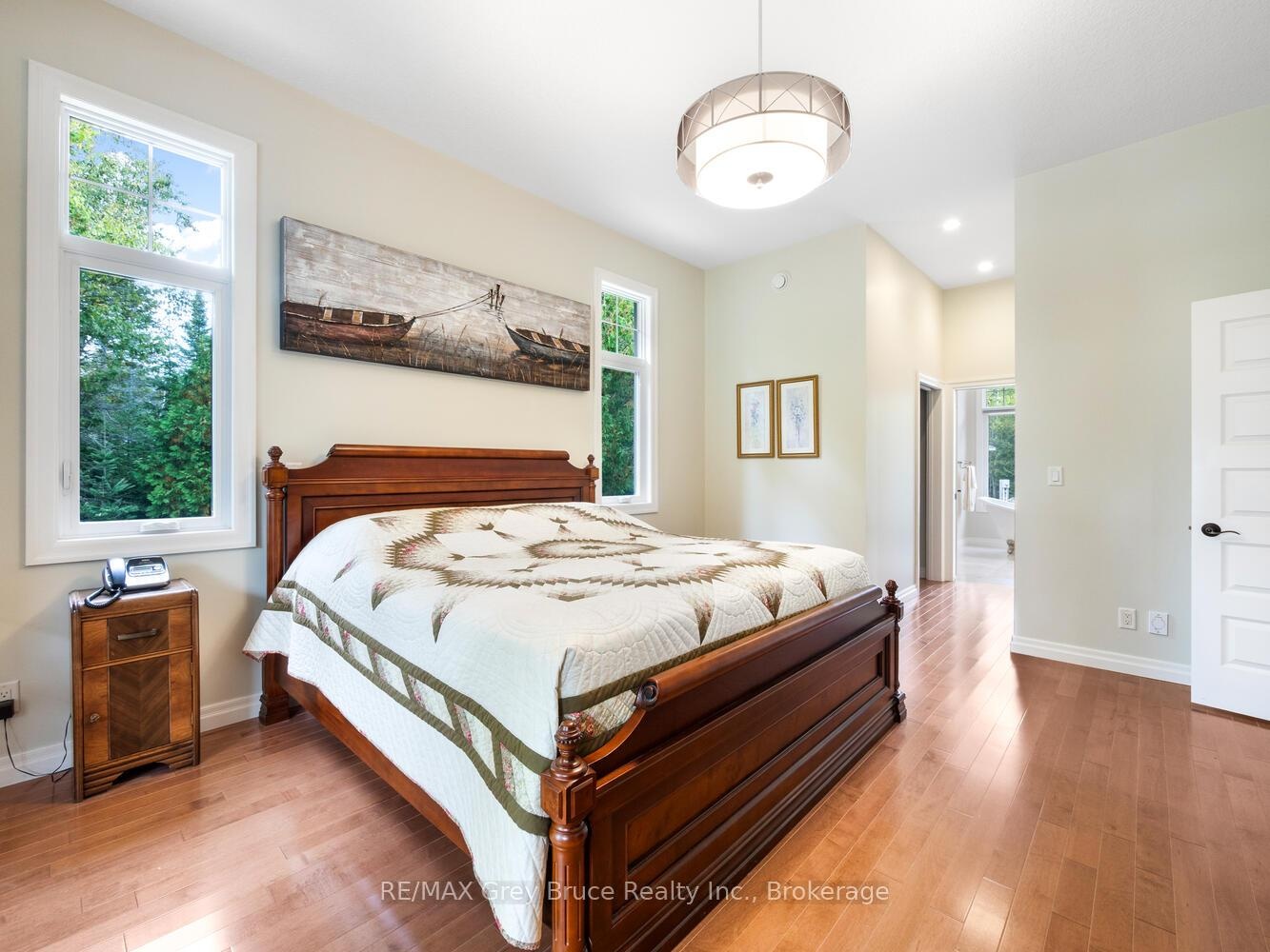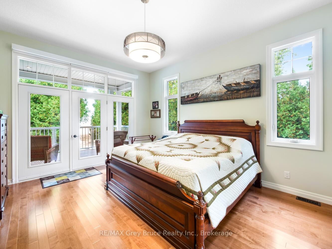 Breathtaking views, quality craftsmanship, and true pride of ownership! Set on a private 1.4-acre lot in a sought-after neighborhood, this well-maintained property features a gently curved driveway leading directly to the clean shoreline of Lake Huron. A dredged channel and L-shaped dock offer a protected harbour perfect for small boats, kayaks, or swimming. Relax under the timber framed pergola with Toja Grid sunshade and take in stunning sunsets by the water. The exterior boasts low-maintenance James Hardie siding and local Wiarton stone. With over 540 sq.ft. of decking - including durable, splinter-free Brazilian Ipe hardwood - there is plenty of space to entertain outdoors. Inside, a large foyer opens to an elegant living space with coffered ceilings, a stone fireplace, and Maple hardwood floors. The custom kitchen is characterized by the Titanium black granite countertops and Hubbardton Forge lighting fixtures. Form blends function with an induction cooktop, BI oven/microwave and plenty of storage. Step from the dining room onto a covered deck with a direct gas line for Barbeques or propane fire table. The main-floor primary suite offers water views, two walk-in closets, and a spa-like 5pc ensuite. A mud/laundry room connects to the attached garage for added convenience. The attached garage is fully finished with PVC lined walls. The walk-out lower level includes two spacious bedrooms, a 3pc bath, a large family room with in-floor heating, and a versatile workshop - ideal for hobbies or storage close to the lake. No shortage of storage space with the additional 24x24 detached garage added in 2020, plus a 8x12 storage shed. Additional features include central vacuum, central air conditioning, automatic whole home generator and water treatment system - all for comfort and peace of mind. 2885sq.ft., 3-bedroom, 2.5-bathroom home. First time on the market - this one-owner home invites you to enjoy peace, comfort, and natural beauty on the stunning Bruce Peninsula.