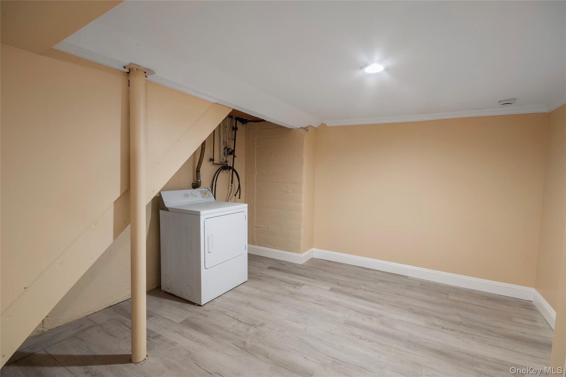 - Washroom with washer / dryer, light wood-type flooring, and ornamental molding