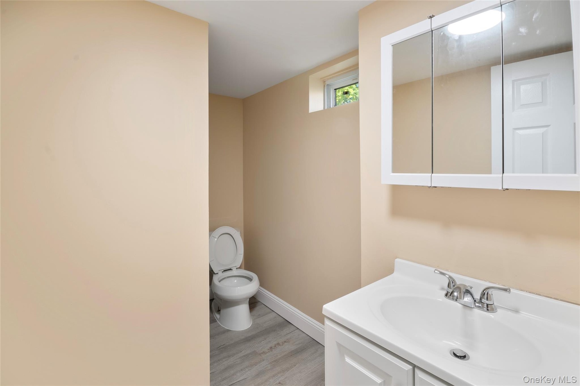 - Half bathroom with vanity and light wood-type flooring