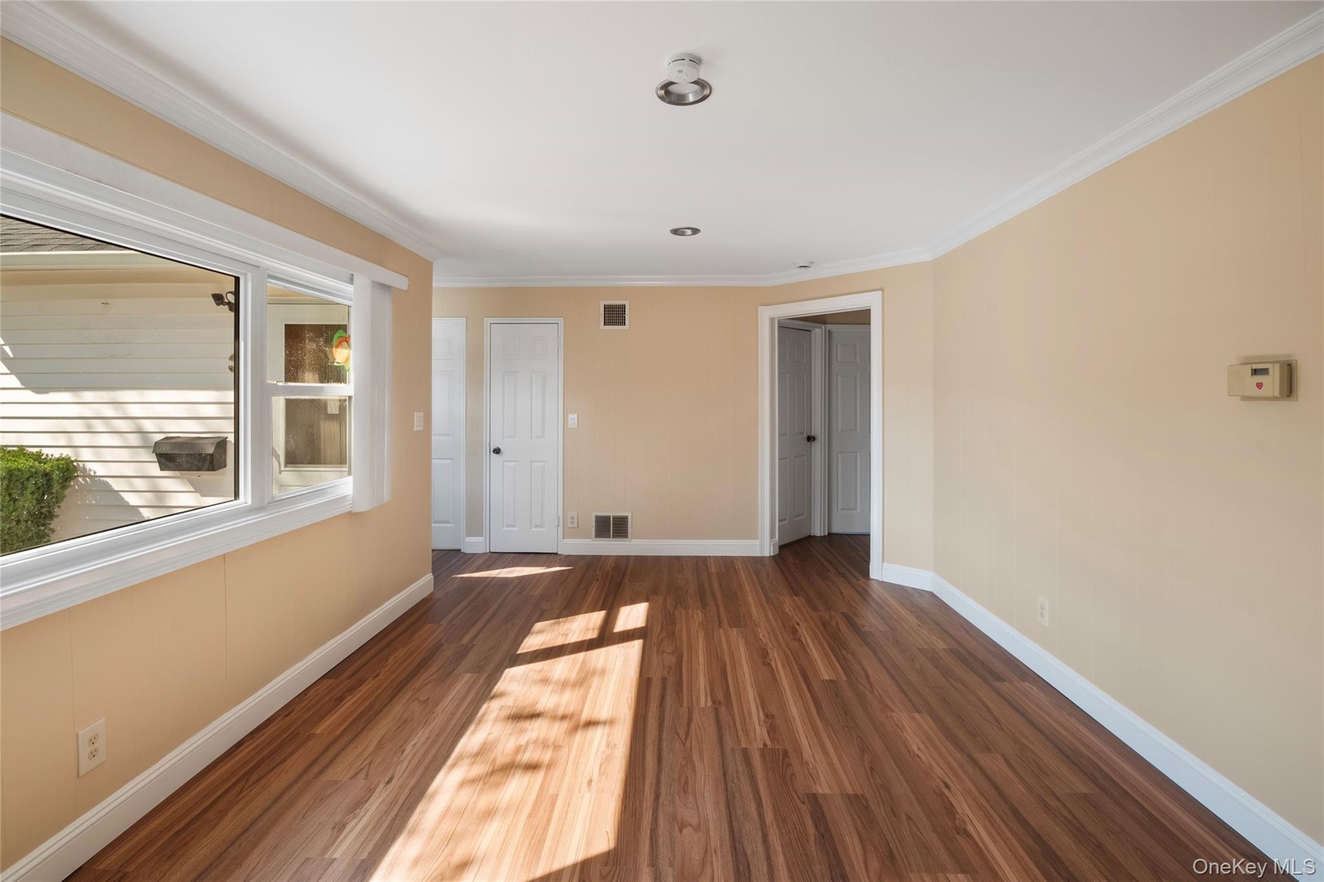 - Unfurnished bedroom with wood finished floors and ornamental molding