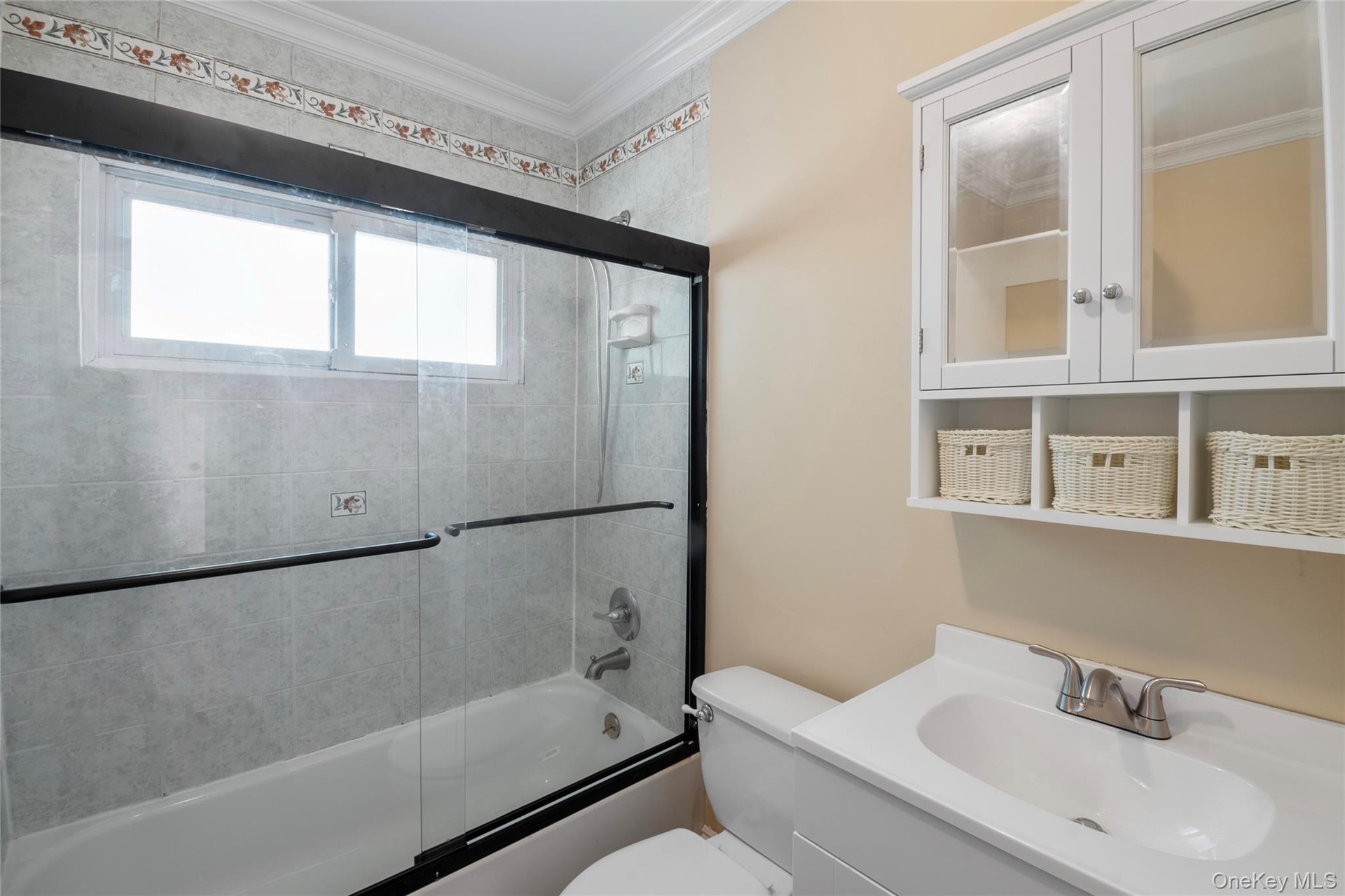 - Bathroom featuring combined bath / shower with glass door, vanity, and crown molding