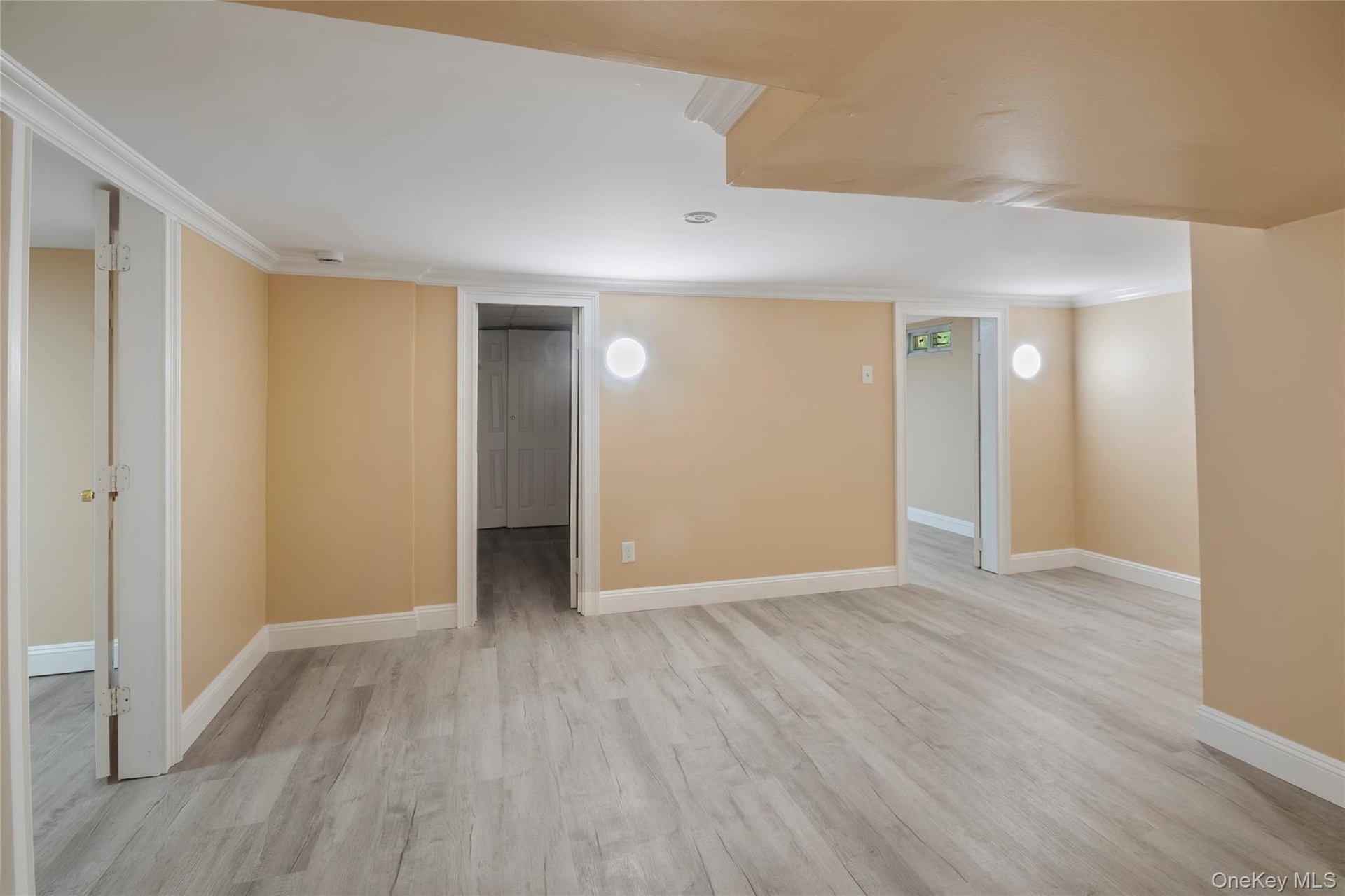 - Empty room featuring light wood-style floors and ornamental molding