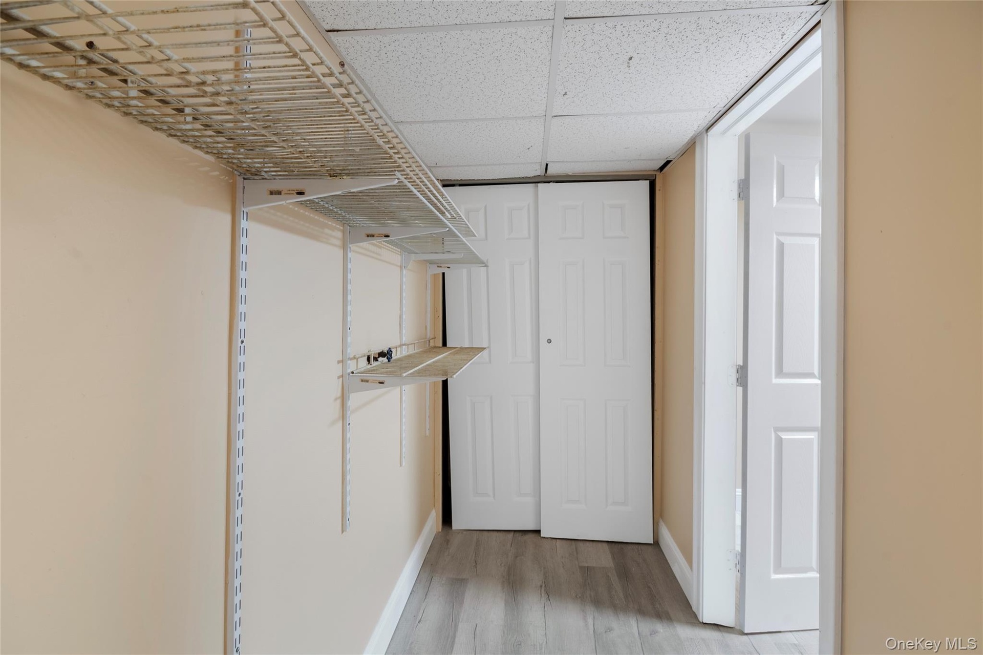 - Walk in closet with a paneled ceiling and light wood-type flooring