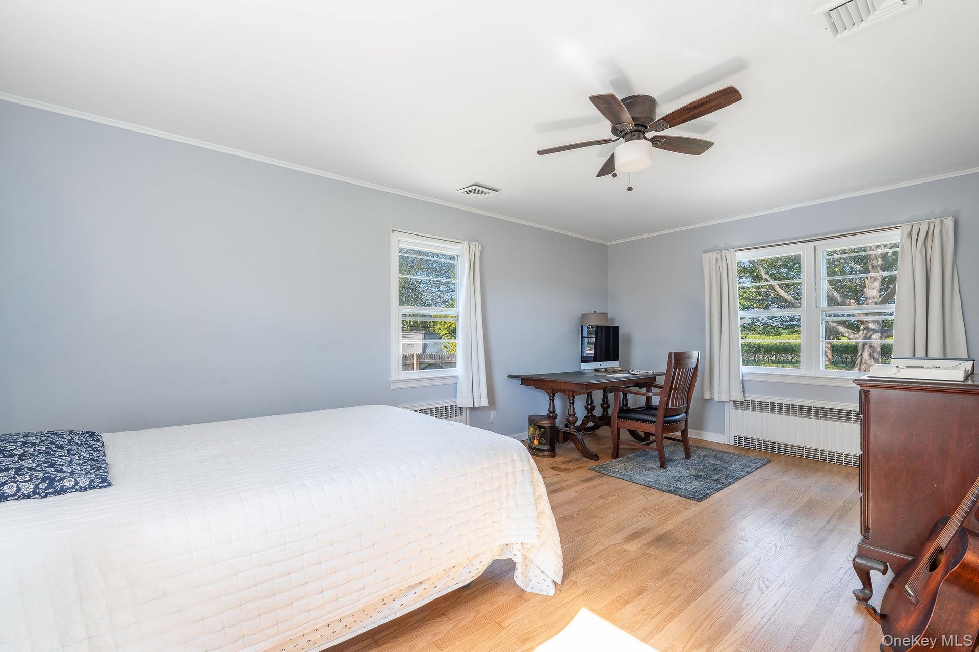- Bedroom with ornamental molding, light wood-style flooring, ceiling fan, an office area, and radiator heating unit