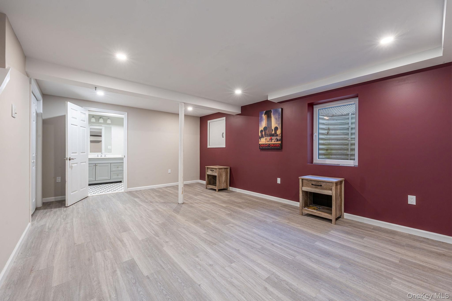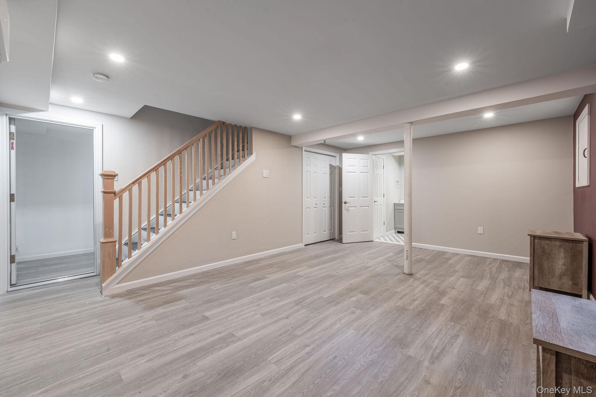 - Finished below grade area with recessed lighting and light wood-style flooring