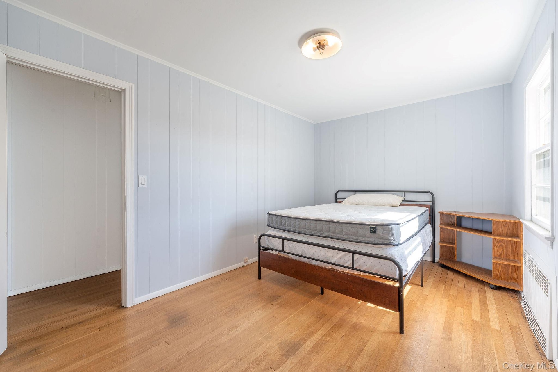 - Bedroom featuring radiator, ornamental molding, wood walls, and light wood-style flooring