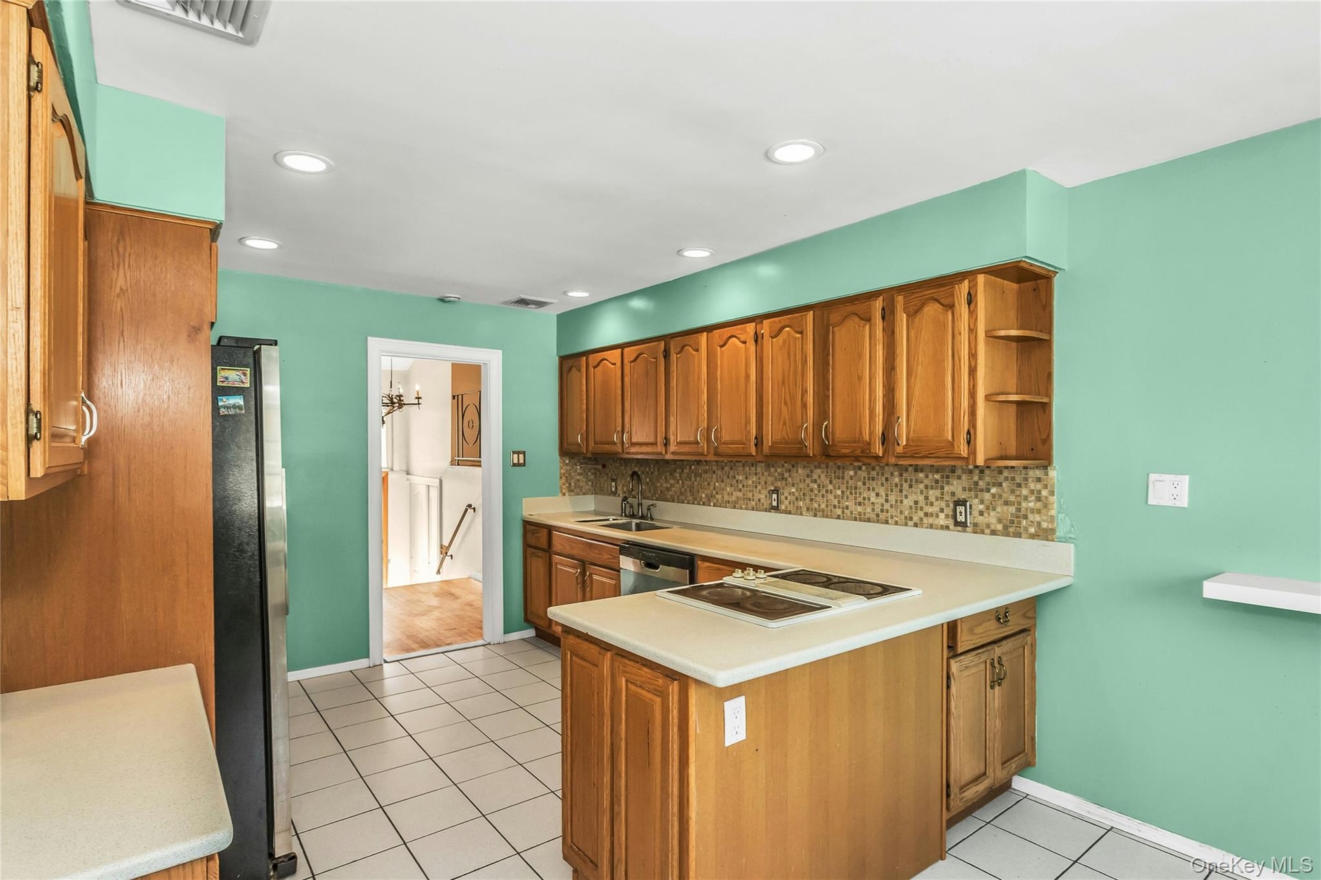 - Kitchen with light tile patterned flooring, brown cabinets, tasteful backsplash, light countertops, and a peninsula