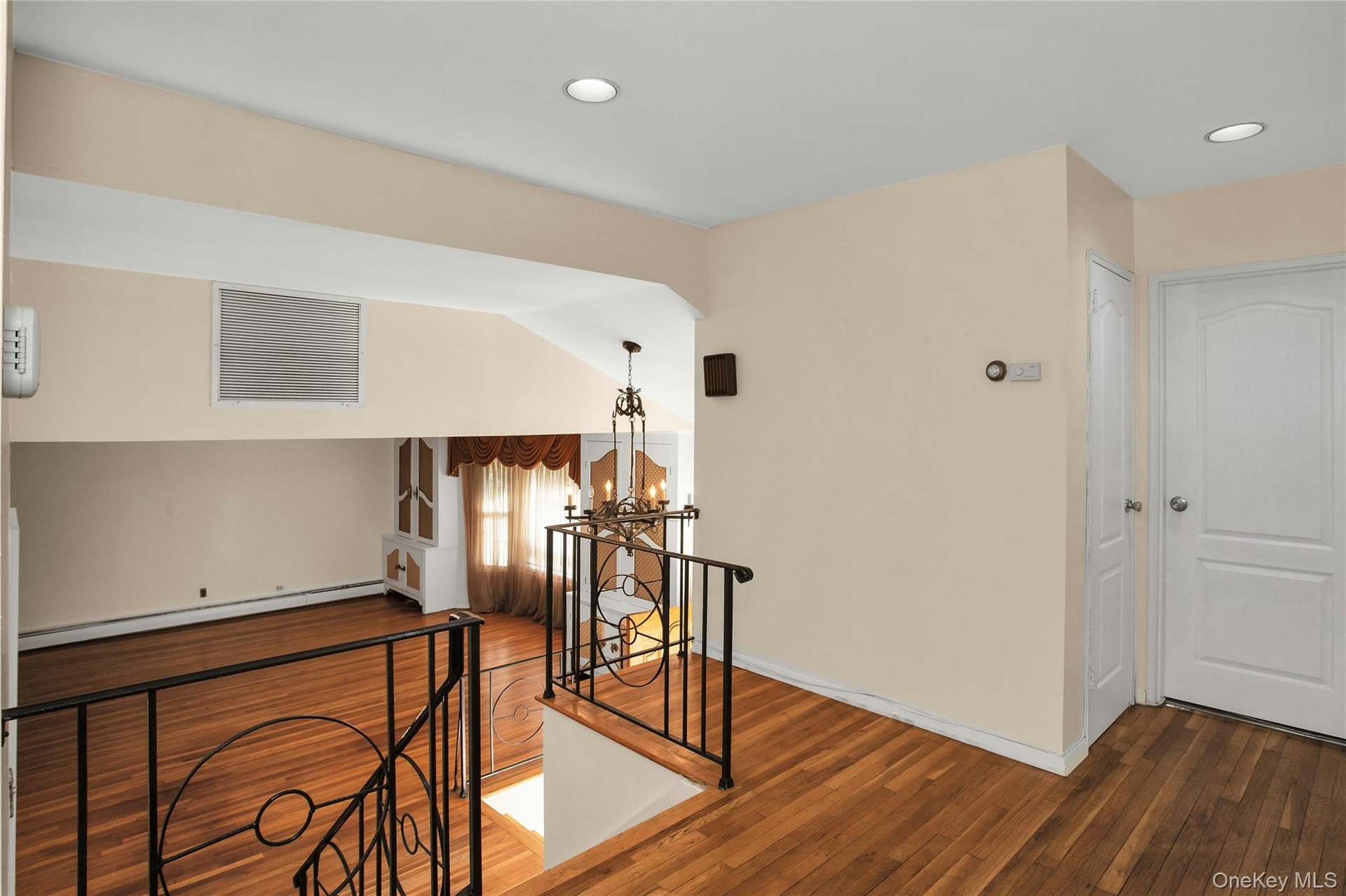 - Hallway with an upstairs landing, wood-type flooring, a baseboard radiator, a chandelier, and recessed lighting