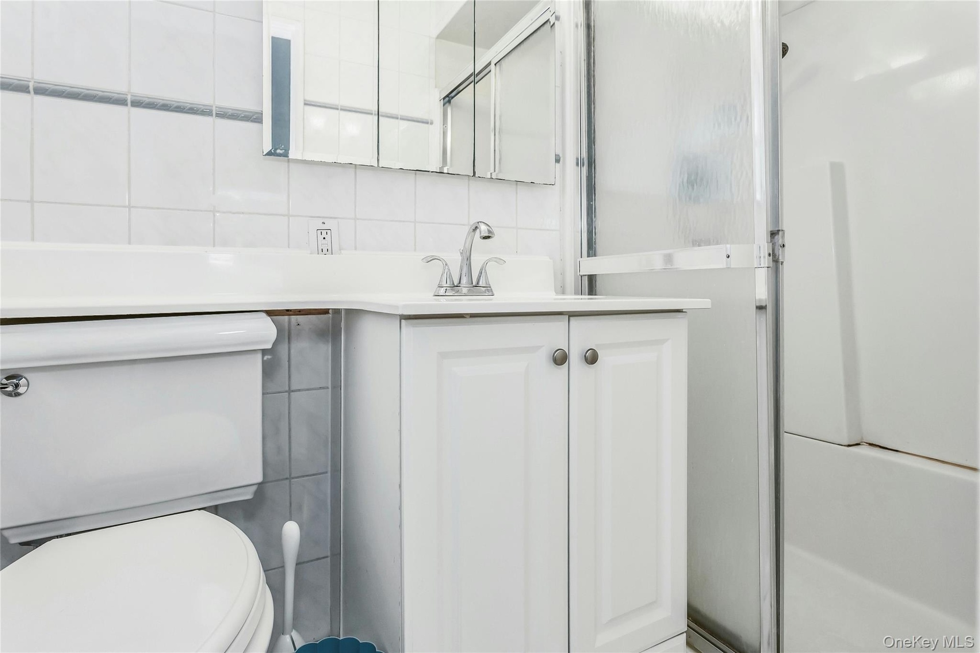 - Bathroom featuring tile walls, vanity, decorative backsplash, and a stall shower