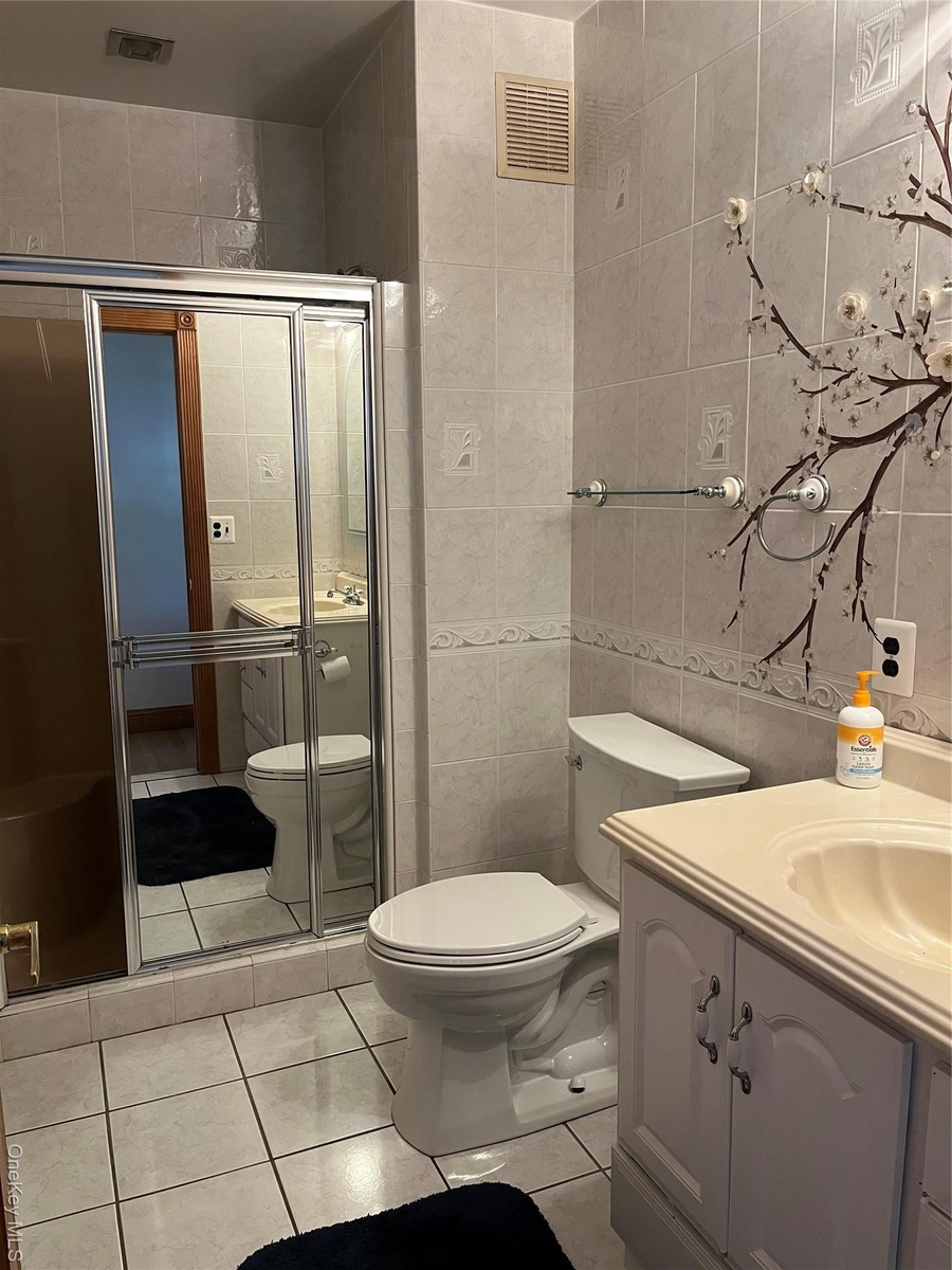 - Full bathroom with tile walls, light tile patterned floors, vanity, and a shower stall