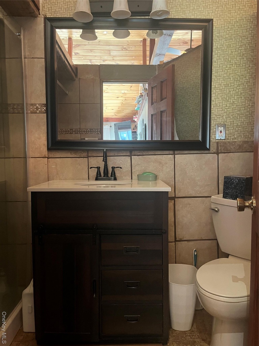 - Bathroom featuring tile walls, vanity, Tile shower stall, and baseboard heating