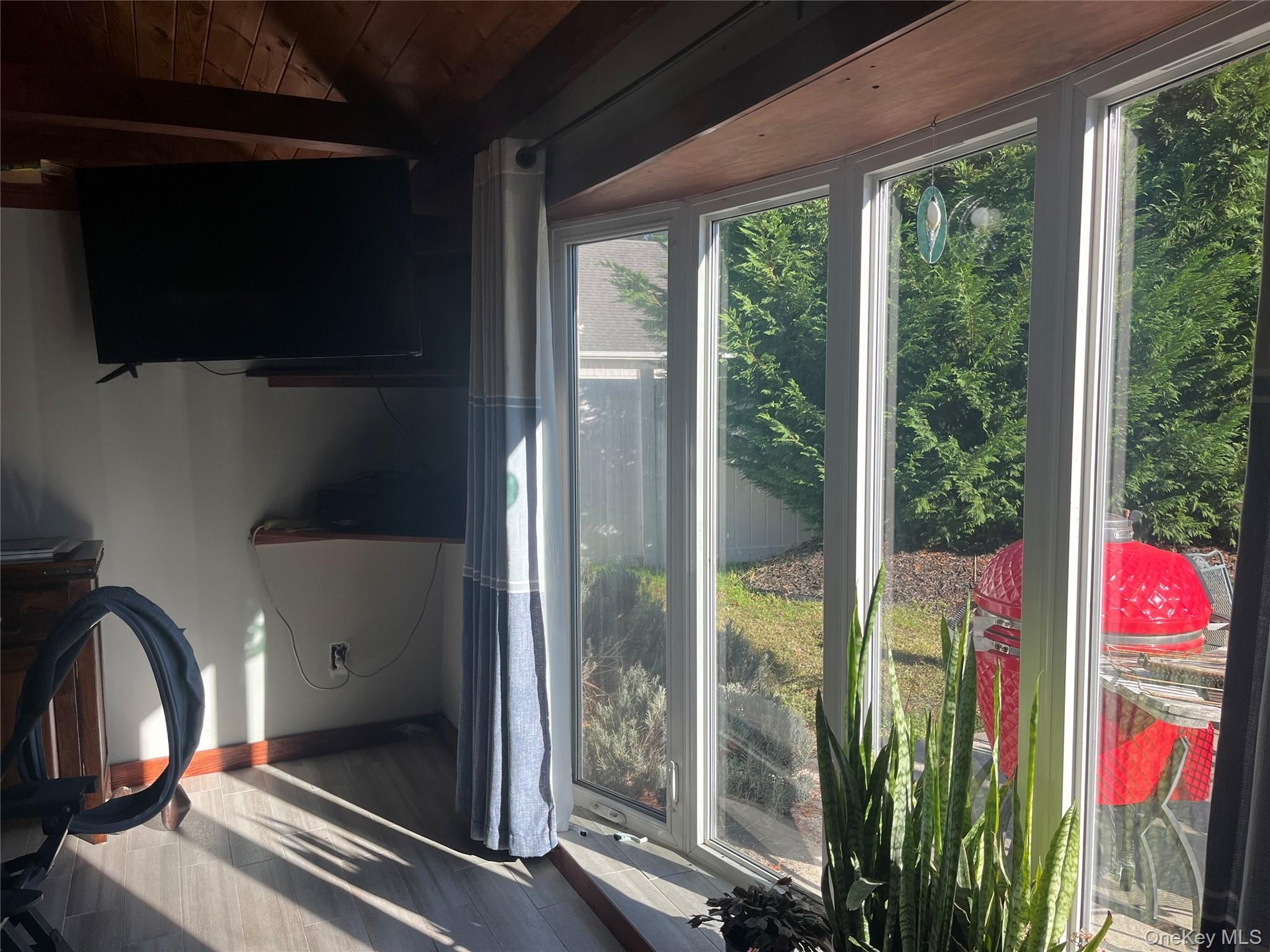 - Living room area in Studio Guest Cottage. Lofted Wooden ceiling and light wood-type flooring
