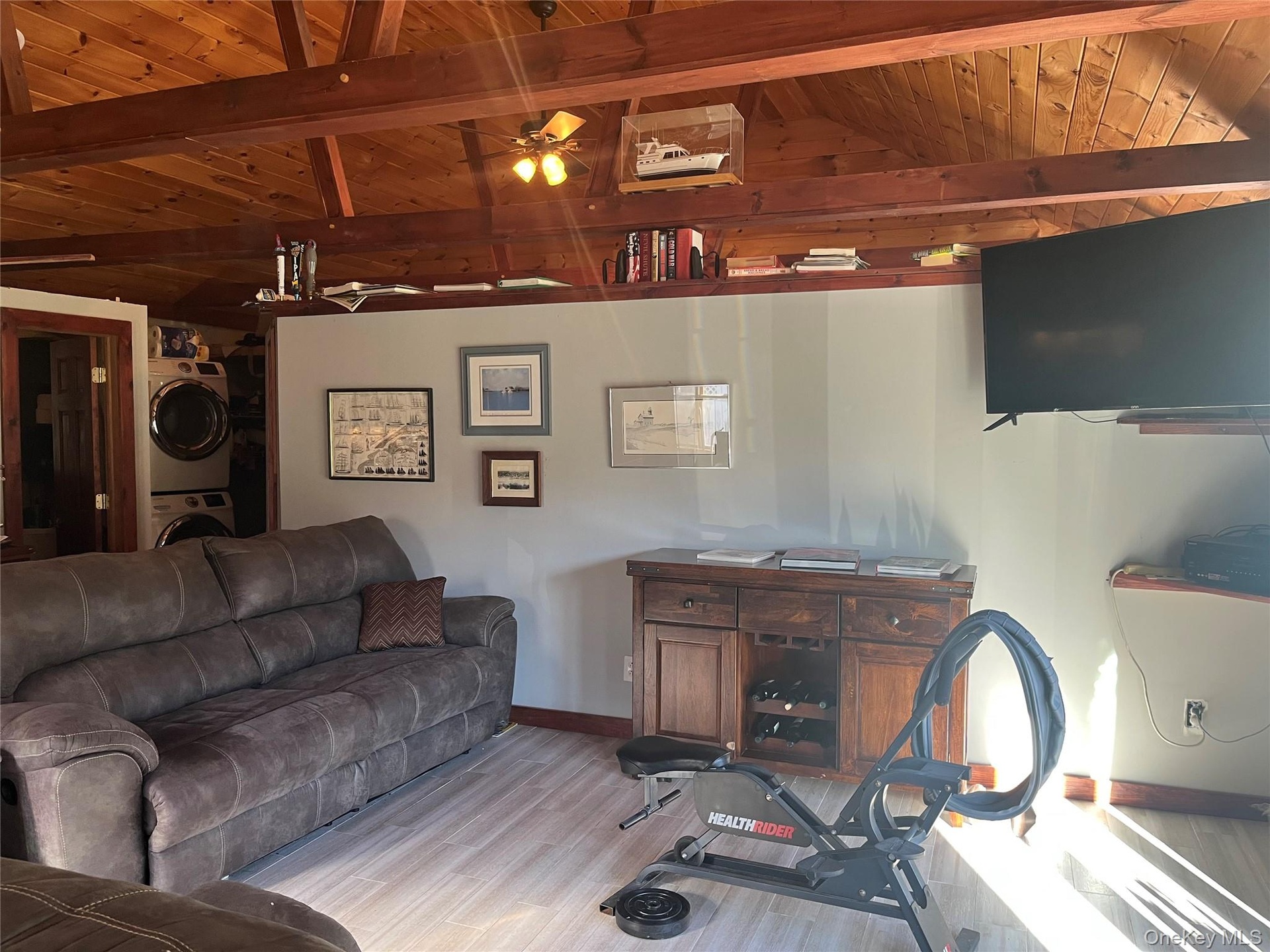 - Living area in Guest Cottage featuring wooden beamed ceiling, wood finished floors, and ceiling fan