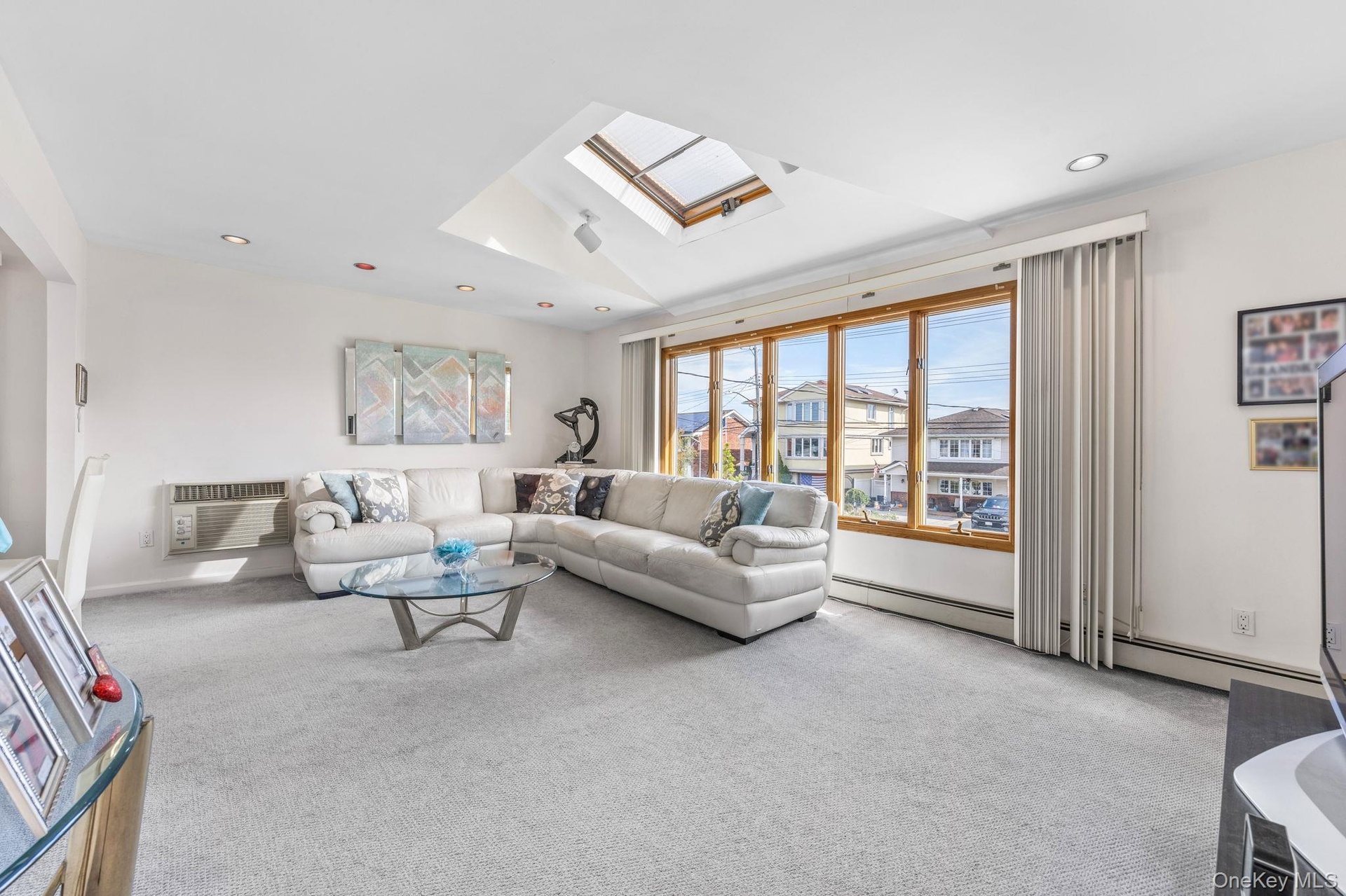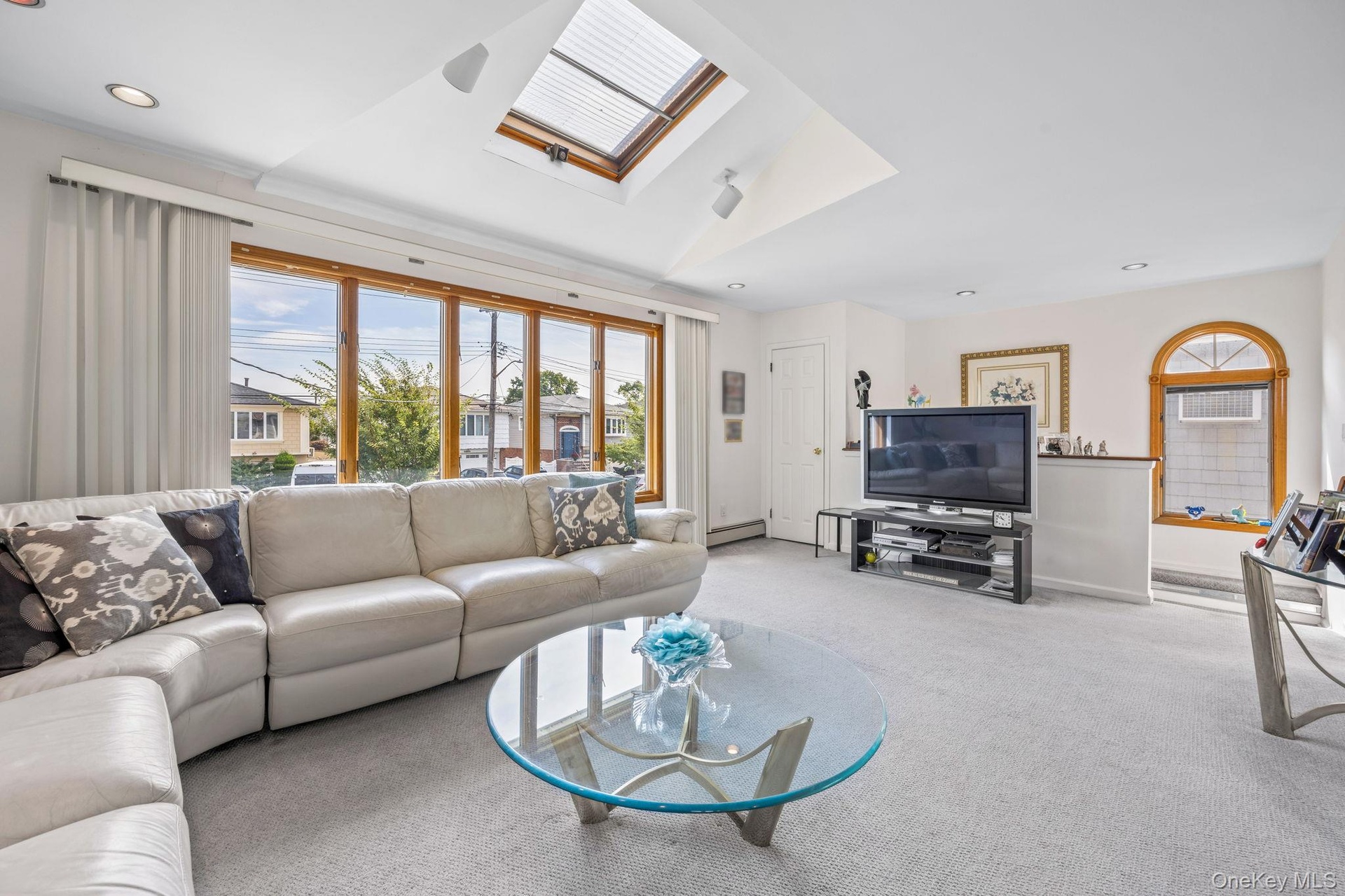 - Carpeted living area featuring a skylight, recessed lighting, and baseboard heating