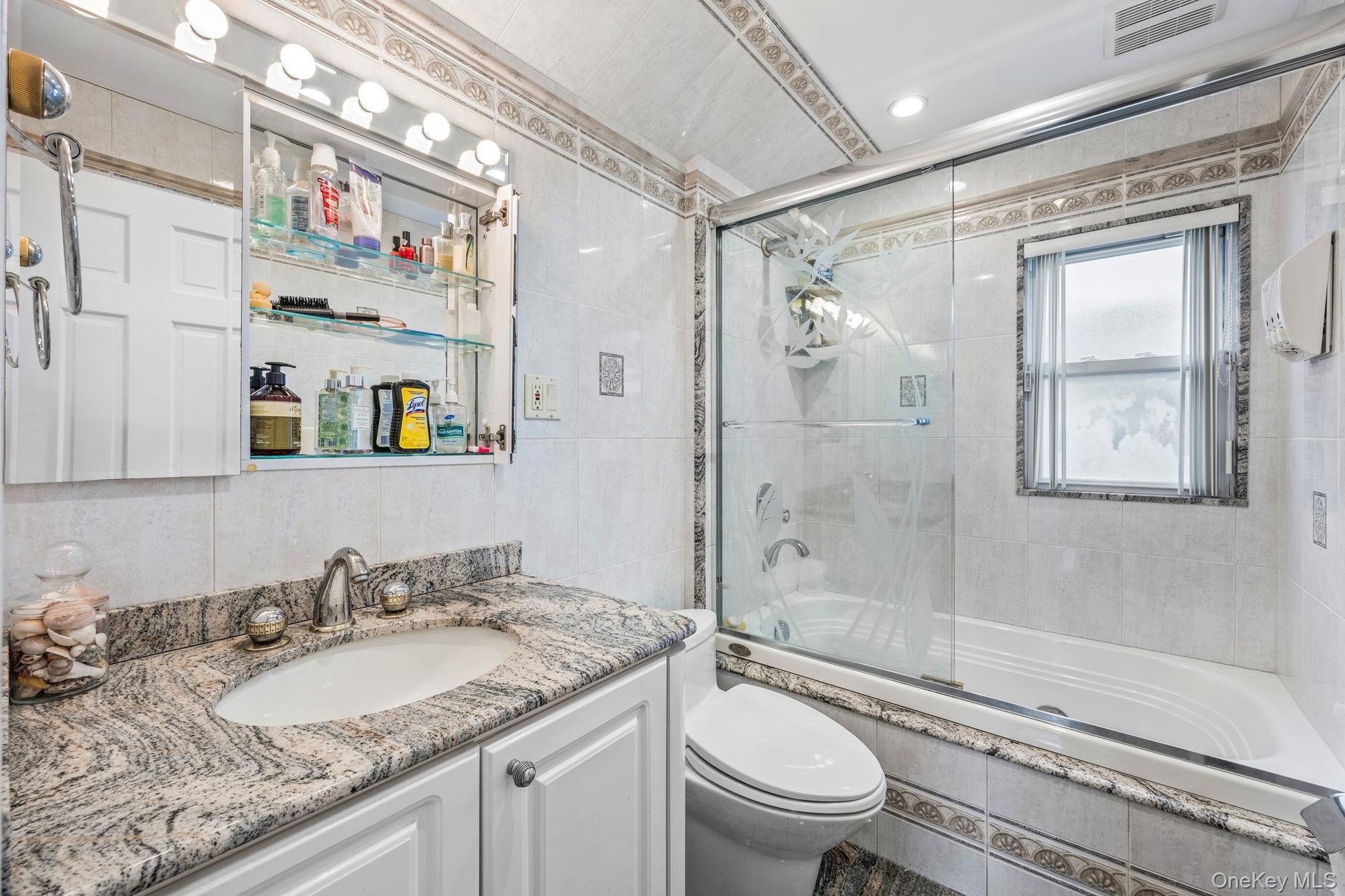 - Full bath featuring tile walls, tiled shower / bath, vanity, and recessed lighting