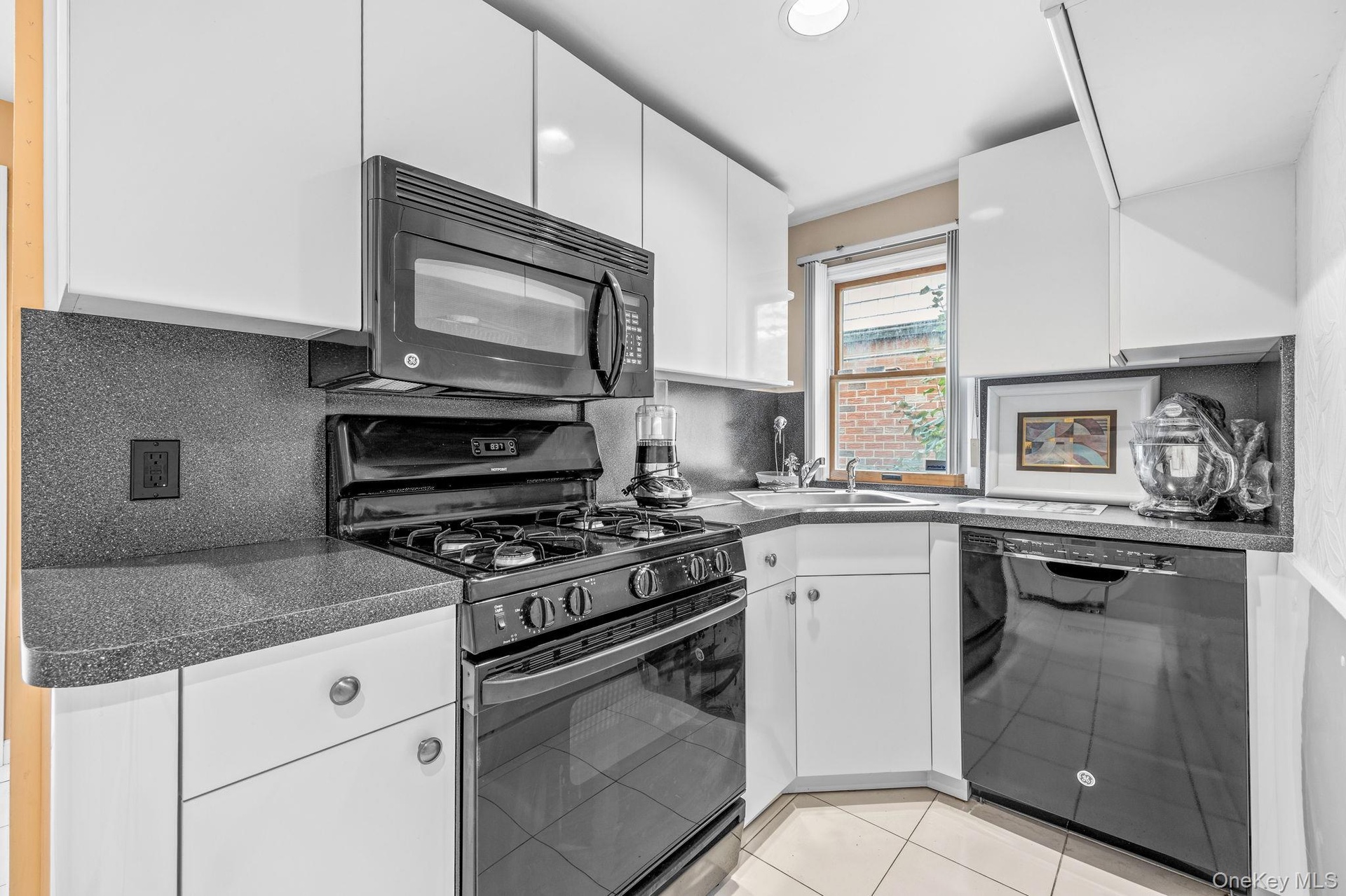 - Kitchen with black appliances, white cabinetry, light tile patterned floors, and backsplash