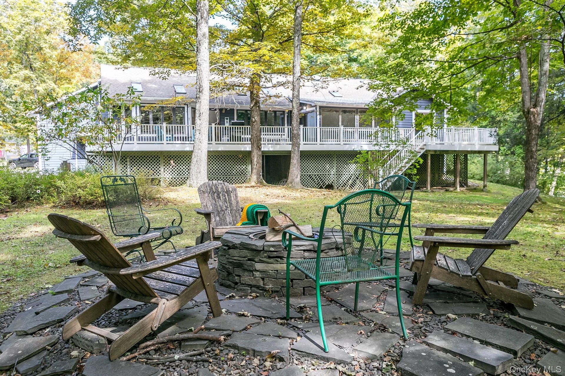 - Deck featuring an outdoor fire pit, a sunroom, and a patio area