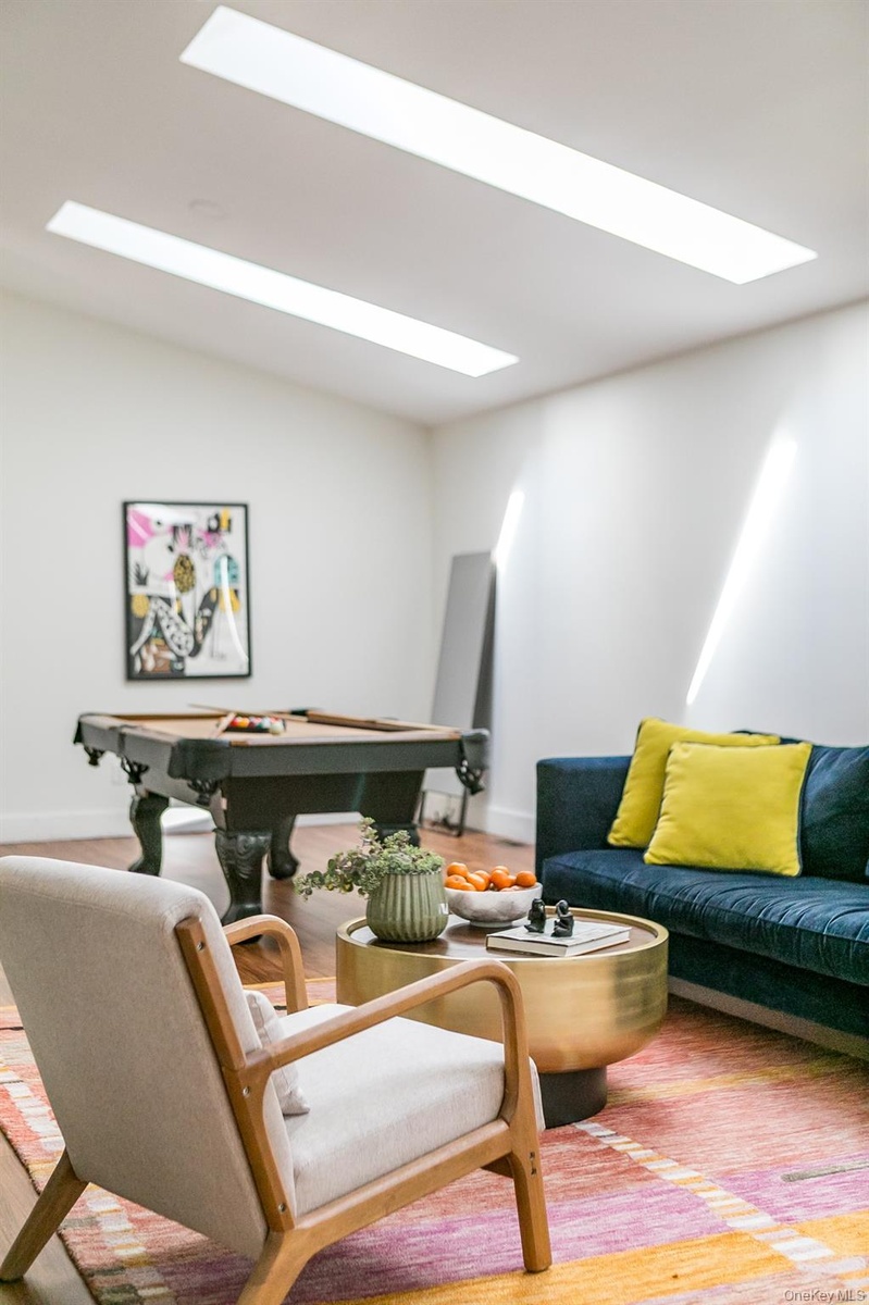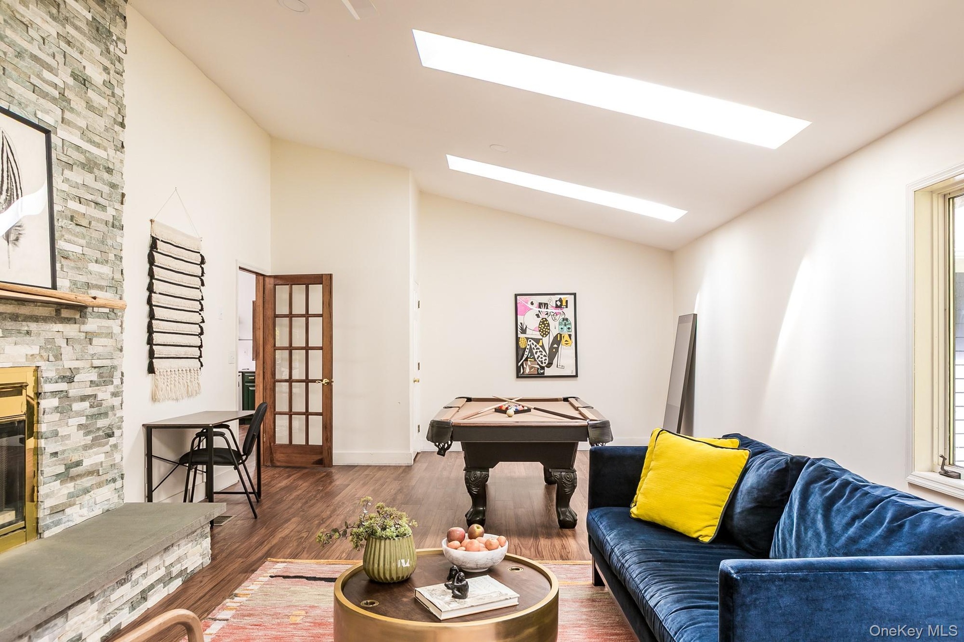 - Living area with a skylight, vaulted ceiling, and light wood-style floors
