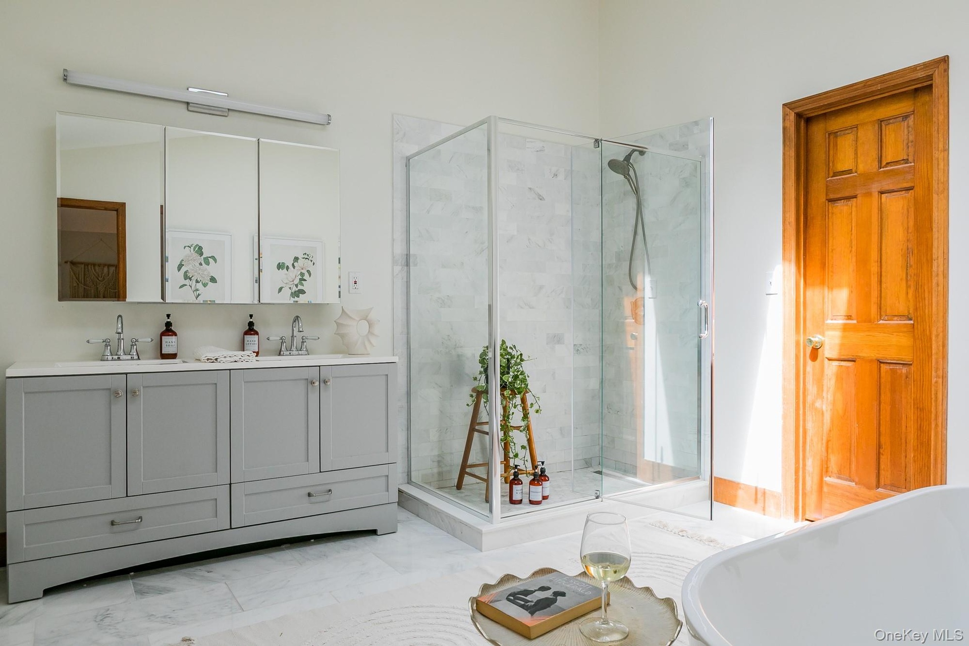 - Full bath with a stall shower, a soaking tub, and double vanity