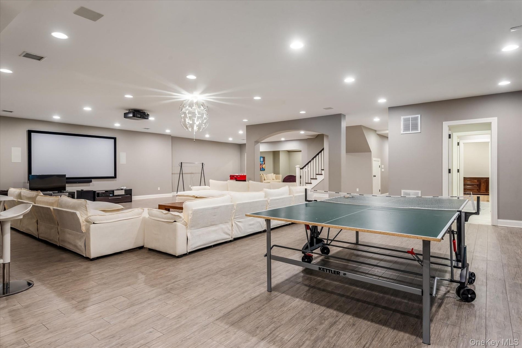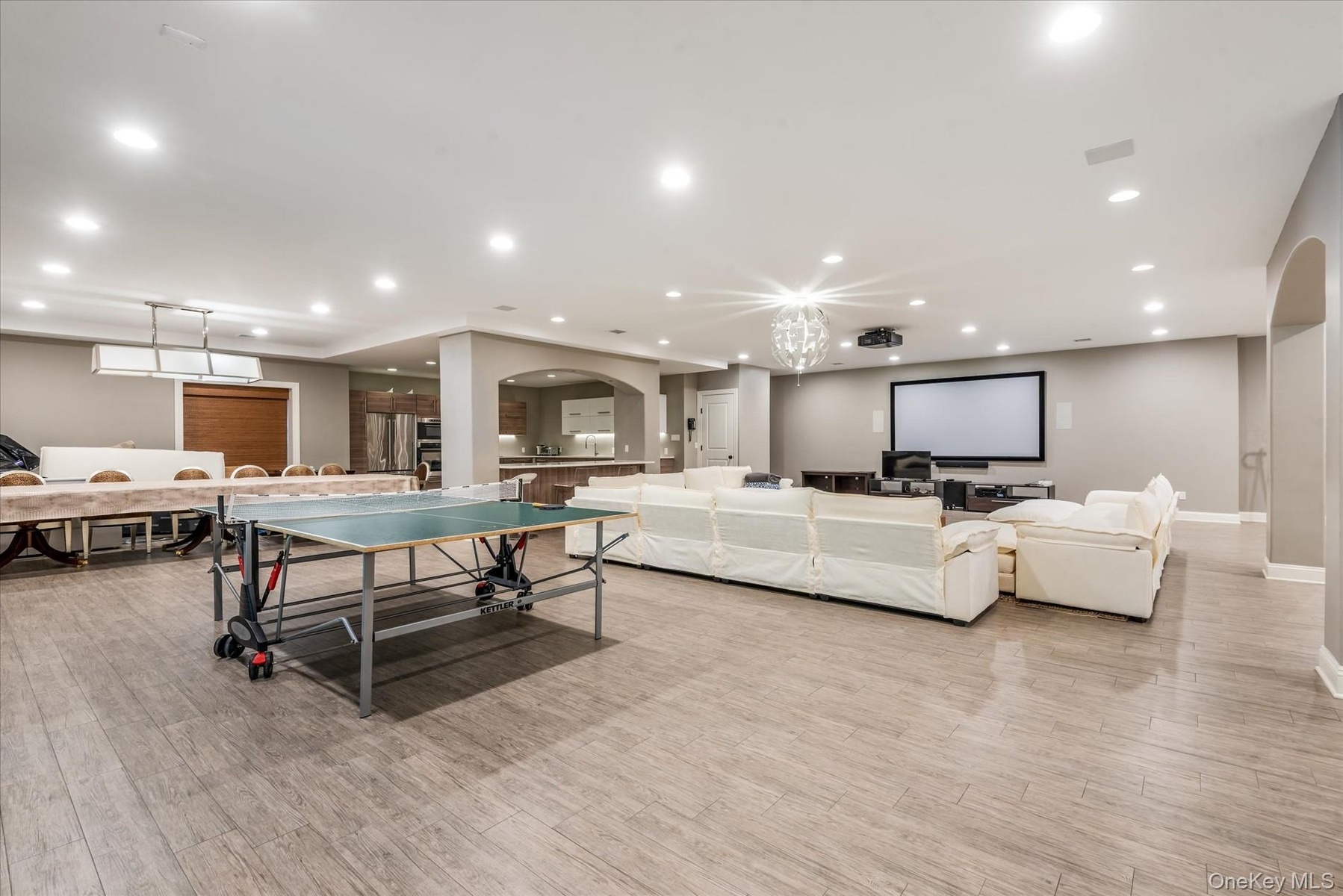 - Playroom featuring arched walkways, recessed lighting, and light wood-style flooring