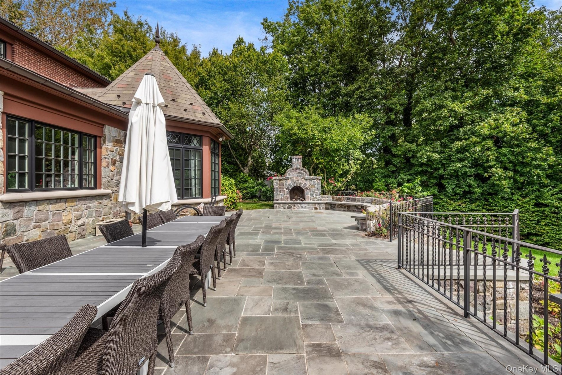 - View of patio / terrace featuring an outdoor stone fireplace, view of scattered trees, and outdoor dining space