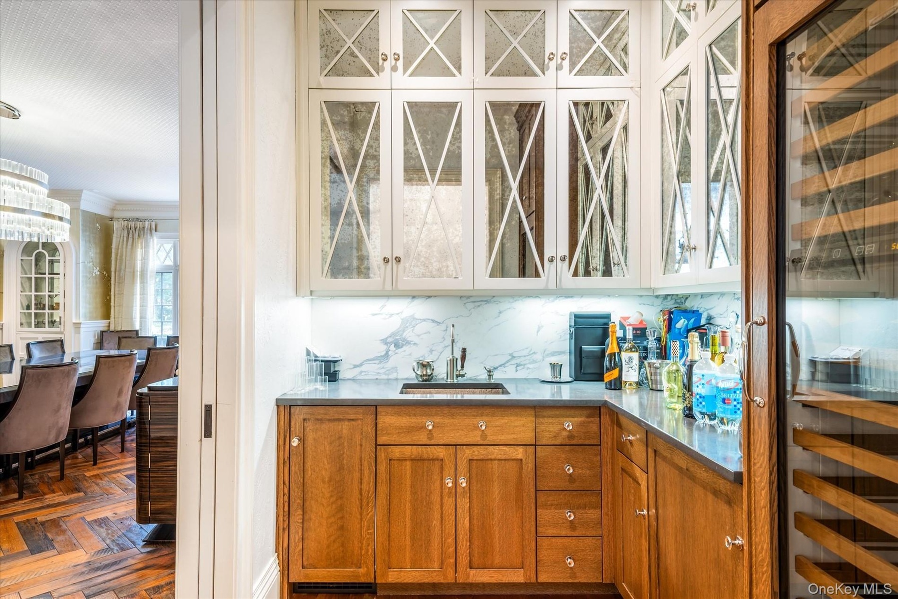 - Indoor wet bar with brown cabinetry, glass insert cabinets, backsplash, light stone countertops, and crown molding