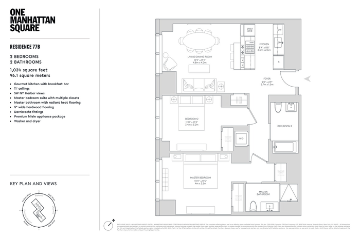 Residence 77B is a 1,034 square foot two bedroom, two bathroom with an open gourmet kitchen and breakfast bar and featuring stunning 11' ceilings. This residence faces South West Warm with incredible NY Harbor views. This residence features imported stone and custom finishes, premium Miele appliance package, 5" wide stained oak flooring, master bath with custom wood cabinetry, marble tile walls and mosaic floors with radiant heat, under-mount Wetstyle sink with glass vanity top and Dornbracht polished chrome faucets and a washer and dryer.
