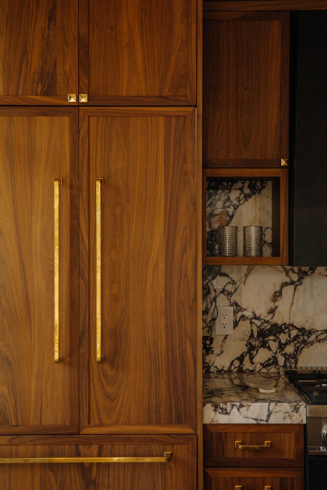 Polished Calacatta Vagli Rosatto marble countertops and chic Waterstone fixtures adorn a windowed kitchen with an eat-in peninsula, balancing rich walnut shaker-style cabinetry with bespoke metal hoods and antique metal mesh accents. The high-end appliance suite includes a 5-burner Bertazzoni Nero range, a Bertazzoni microwave oven drawer, and a Fisher & Paykel French door refrigerator.
