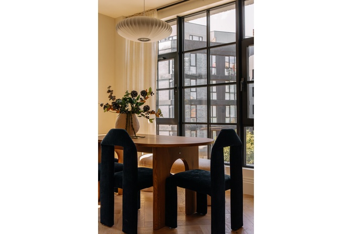 Interiors are marked by an expansive floor-through layout and an open -plan living area . Southern and western light pours through picturesque, oversized windows. French vanilla honed marble door thresholds punctuate matte herringbone white oak floors, and custom 32-inch-high wainscoting runs throughout .