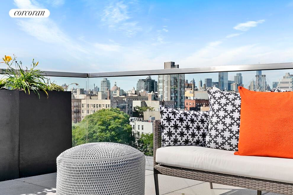 An expansive, fully furnished and landscaped roof deck overlooking Brooklyn and Manhattan