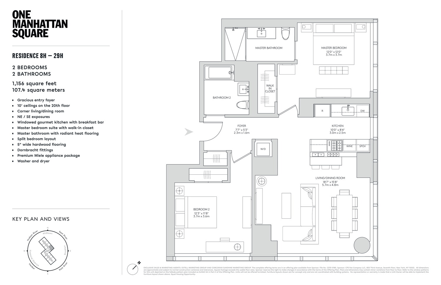 Residence 25H is a 1156 square foot two bedroom, two bathroom, with an open gourmet kitchen and breakfast bar. This spacious residence faces North East and South East with expansive Empire State, Midtown, and East River views. Warm, modern interiors are brought to life by the renowned design team at Meyer Davis Studio. This residence features imported stone and custom finishes, premium Miele appliance package, 5" wide stained oak flooring, master bath with custom wood cabinetry, marble tile walls and mosaic floors with radiant heat, under-mount Wetstyle sink with glass vanity top and Dornbracht polished chrome faucets and a washer and dryer.