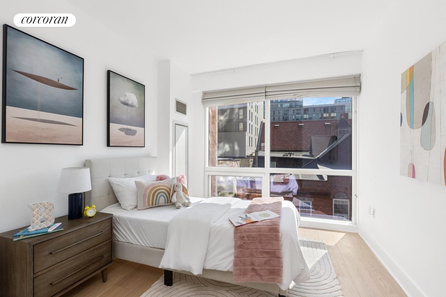 The second and third bedrooms are well-proportioned and filled with natural light, each with its own closet. They share a beautifully finished hall bathroom clad in Blue Azur Limestone, also featuring Waterworks hardware and refined detailing.