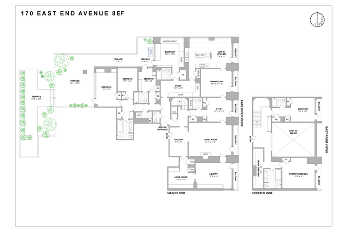 170 East End Avenue, Residence 8E/F is a sophisticated 5,000 square foot, 6+ bedroom, 6+ bathroom duplex with an impressive ~2,300 square feet of private outdoor space. This bright, vibrant home is complete with designer finishes, floor-to-ceiling windows and panoramic views of Carl Schurz Park, the East River & beyond from nearly every room.