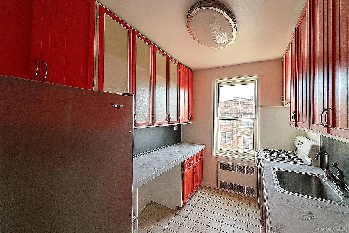 - Kitchen with freestanding refrigerator, light countertops, light tile patterned floors, gas range gas stove, and radiator