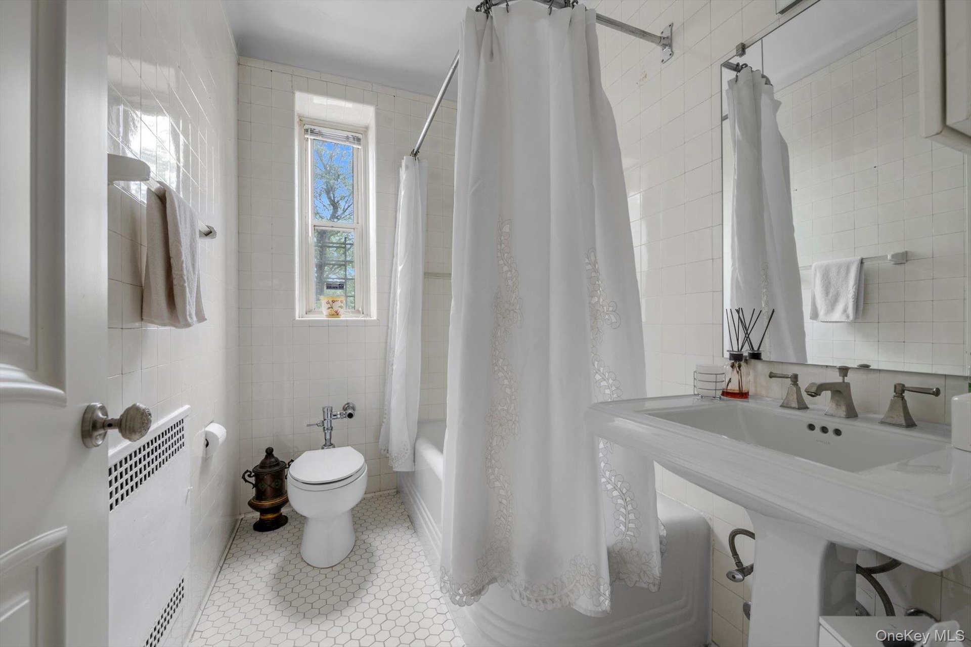 - Full bath with tile walls, shower / bathtub combination with curtain, radiator, and light tile patterned floors