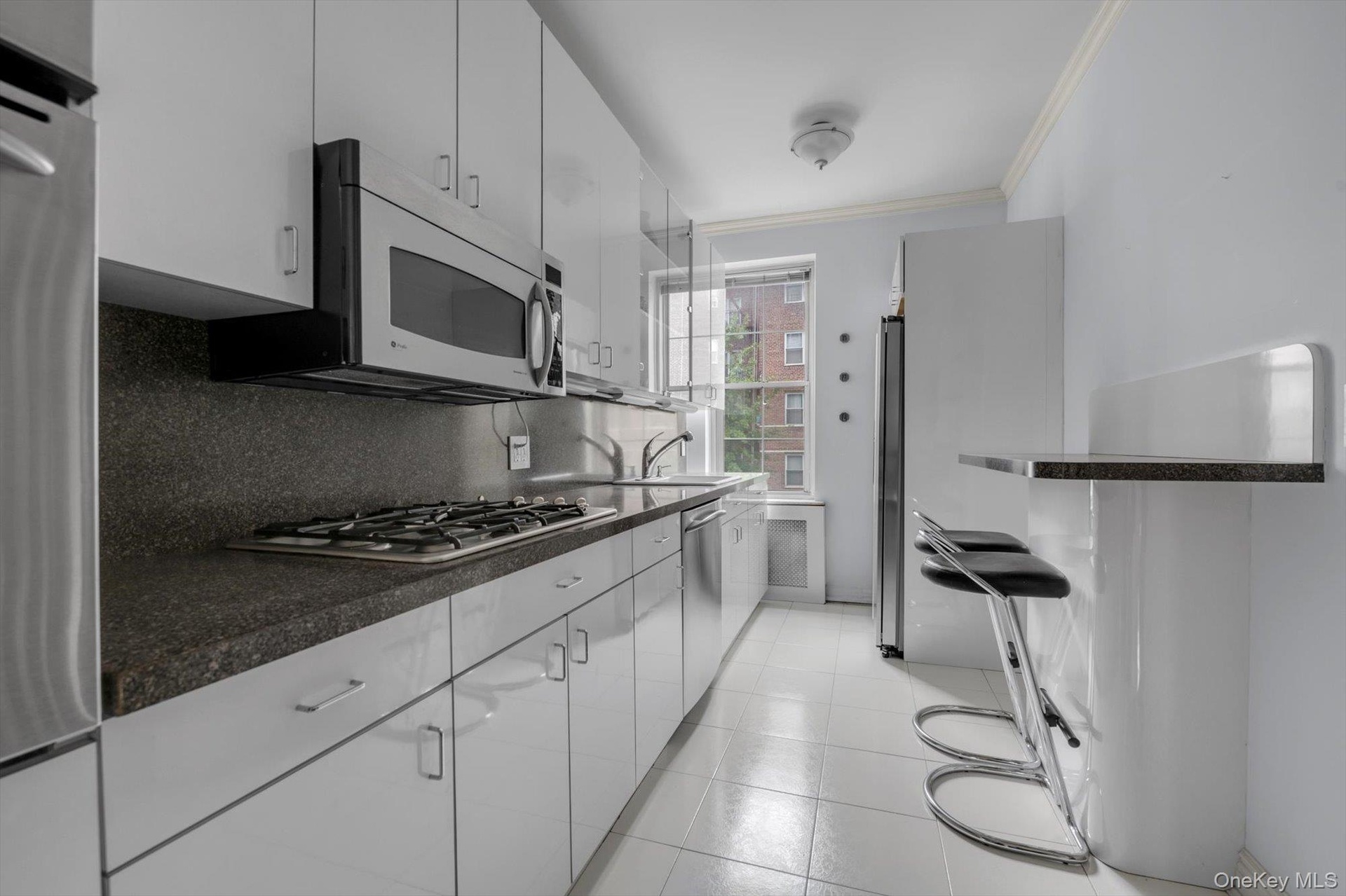 - Kitchen with ornamental molding, appliances with stainless steel finishes, white cabinets, light tile patterned flooring, and dark countertops