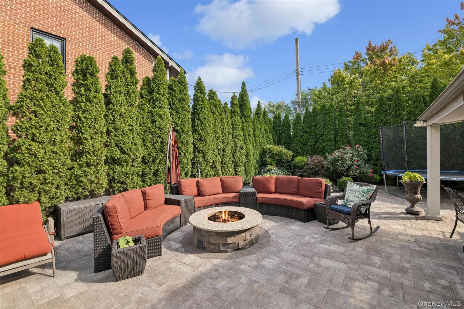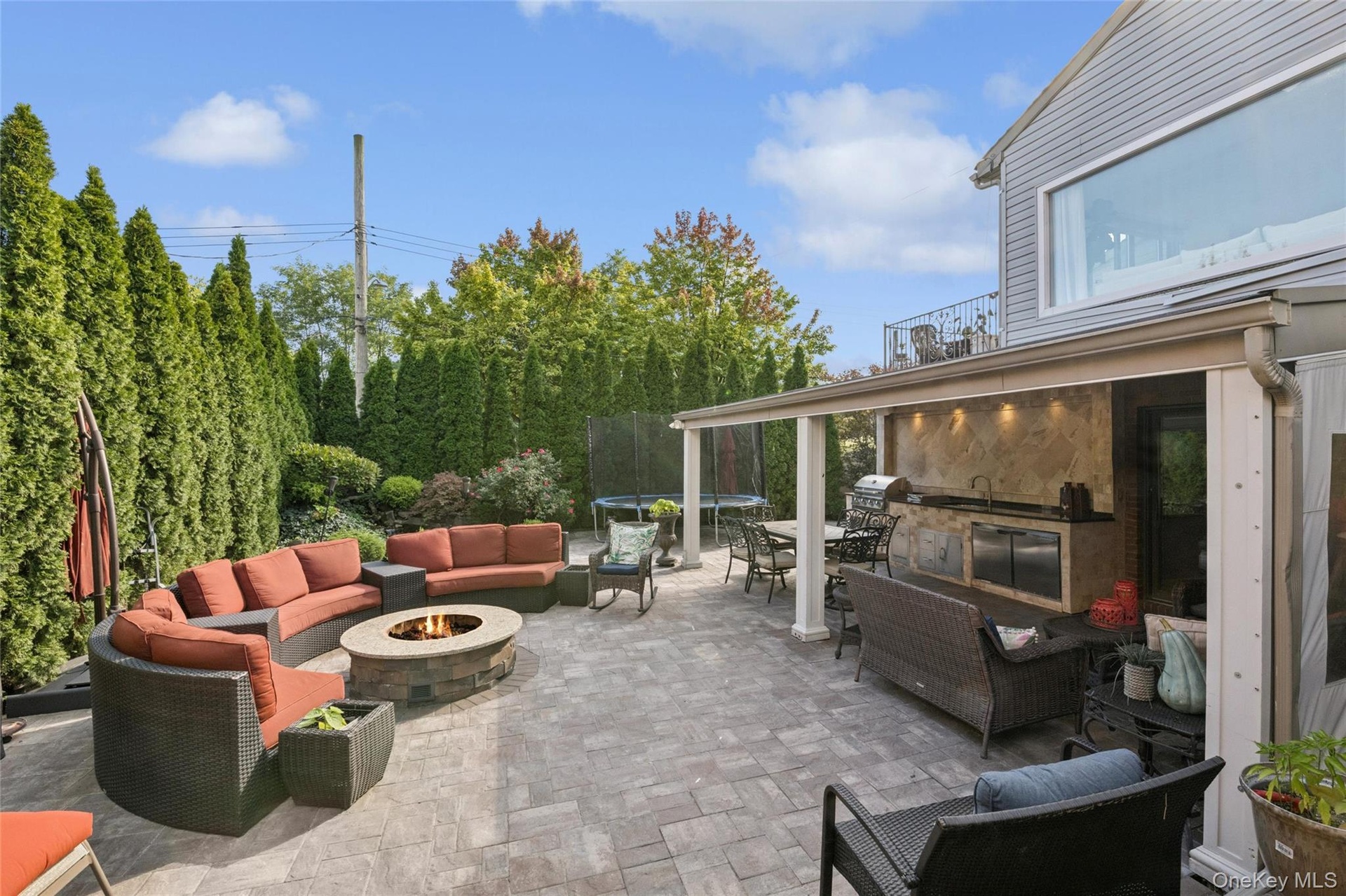 - View of patio / terrace with a trampoline and an outdoor living space with a fire pit