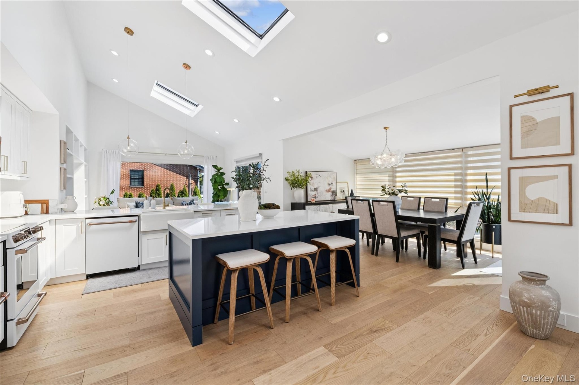 - Kitchen featuring a skylight, white cabinetry, decorative light fixtures, white appliances, and a breakfast bar