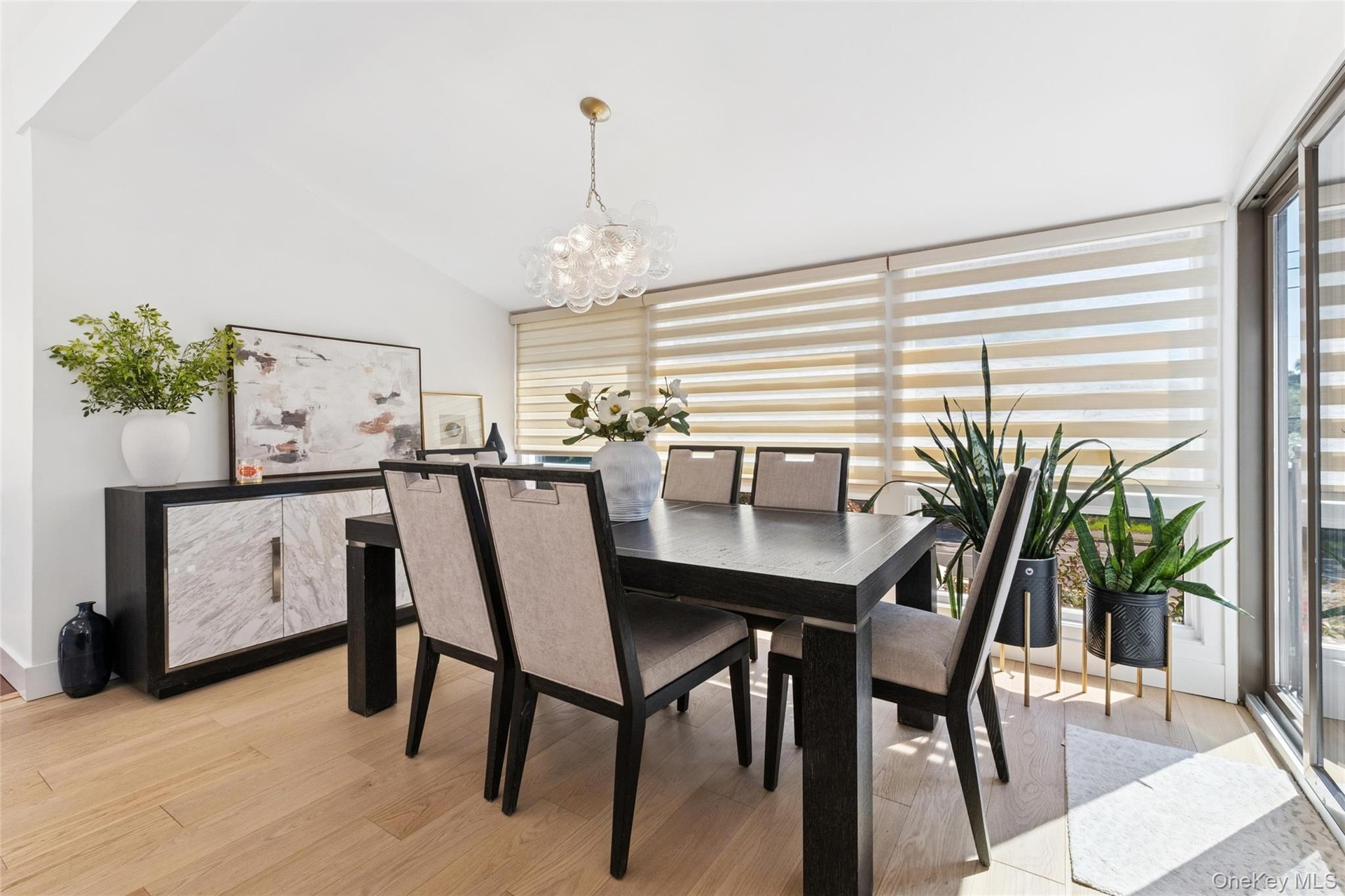 - Dining area featuring light wood-style flooring, vaulted ceiling, and a chandelier