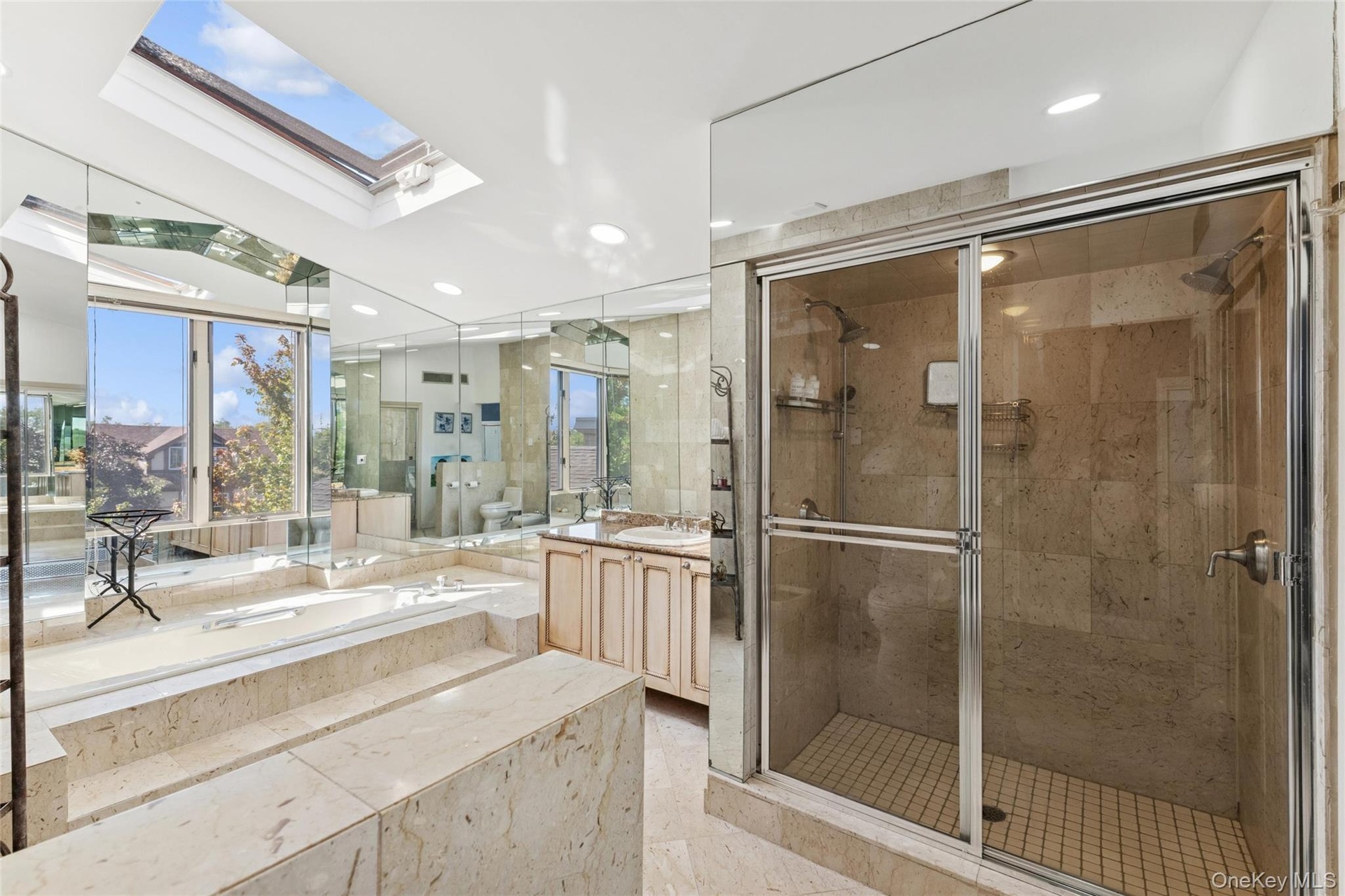 - Bathroom featuring a shower stall, a bath, vanity, recessed lighting, and a skylight