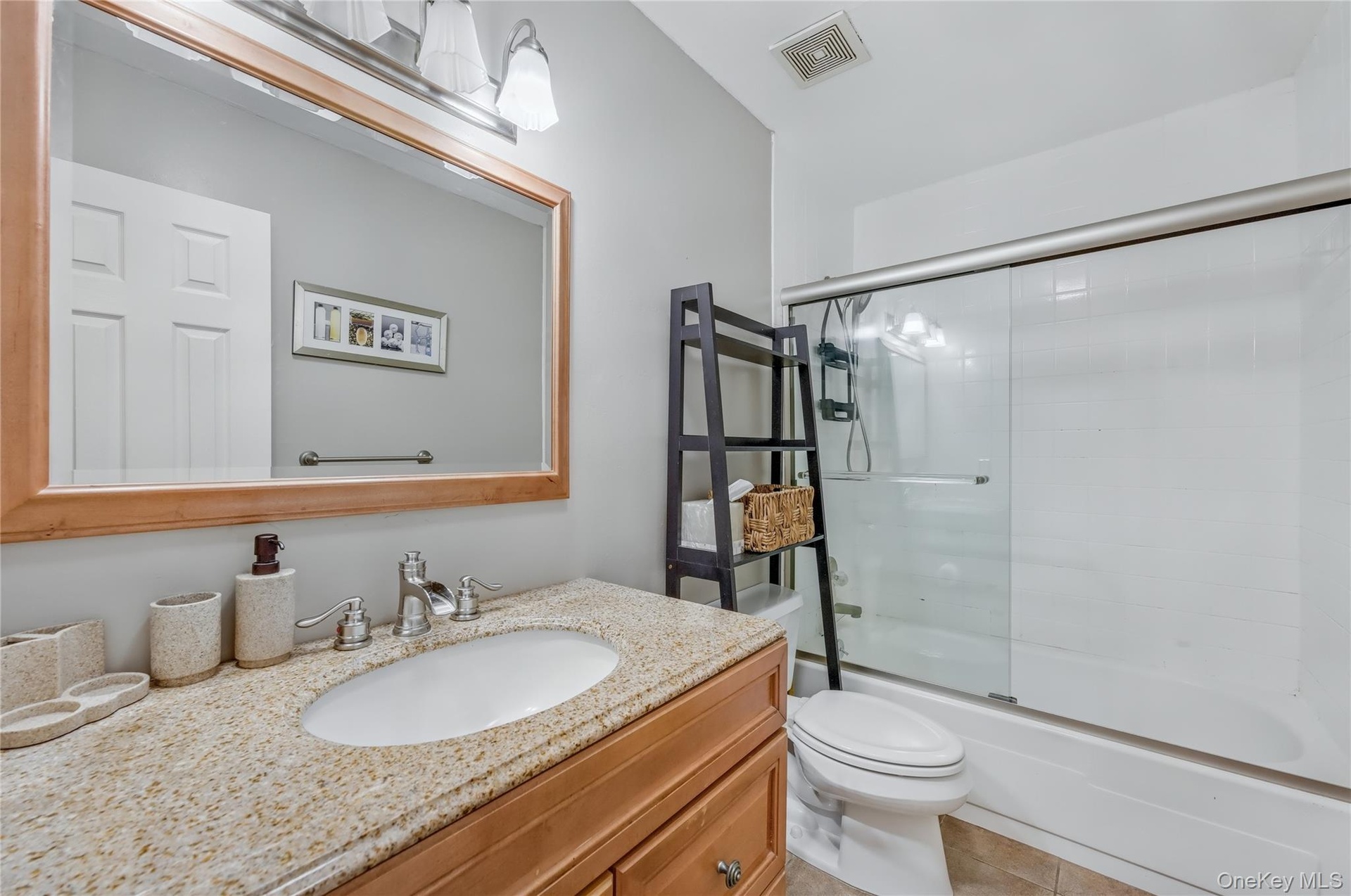 - Full bath featuring shower / bath combination with glass door, vanity, and light tile patterned floors