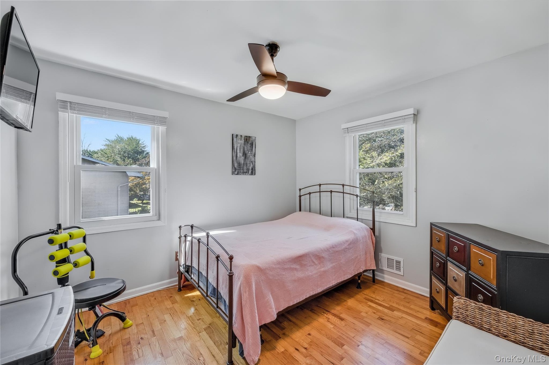 - Bedroom featuring wood finished floors, ceiling fan, a baseboard heating unit, and a baseboard radiator