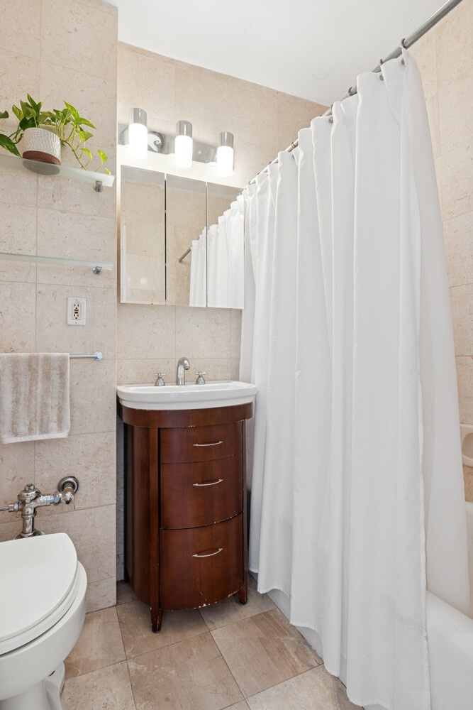 The large living room is spacious enough for relaxing and entertaining while affording plenty of room for a separate dining area. The windowed kitchen has high-end stainless-steel appliances, polished granite counters and back splash, and a polished stone floor. The plentiful white cabinets add to the subtle color palate of the kitchen while providing excellent storage space. The recently renovated bathroom has marble tiles and floor. It is adjacent to the bedroom allowing for privacy. There are hard wood floors throughout the apartment.