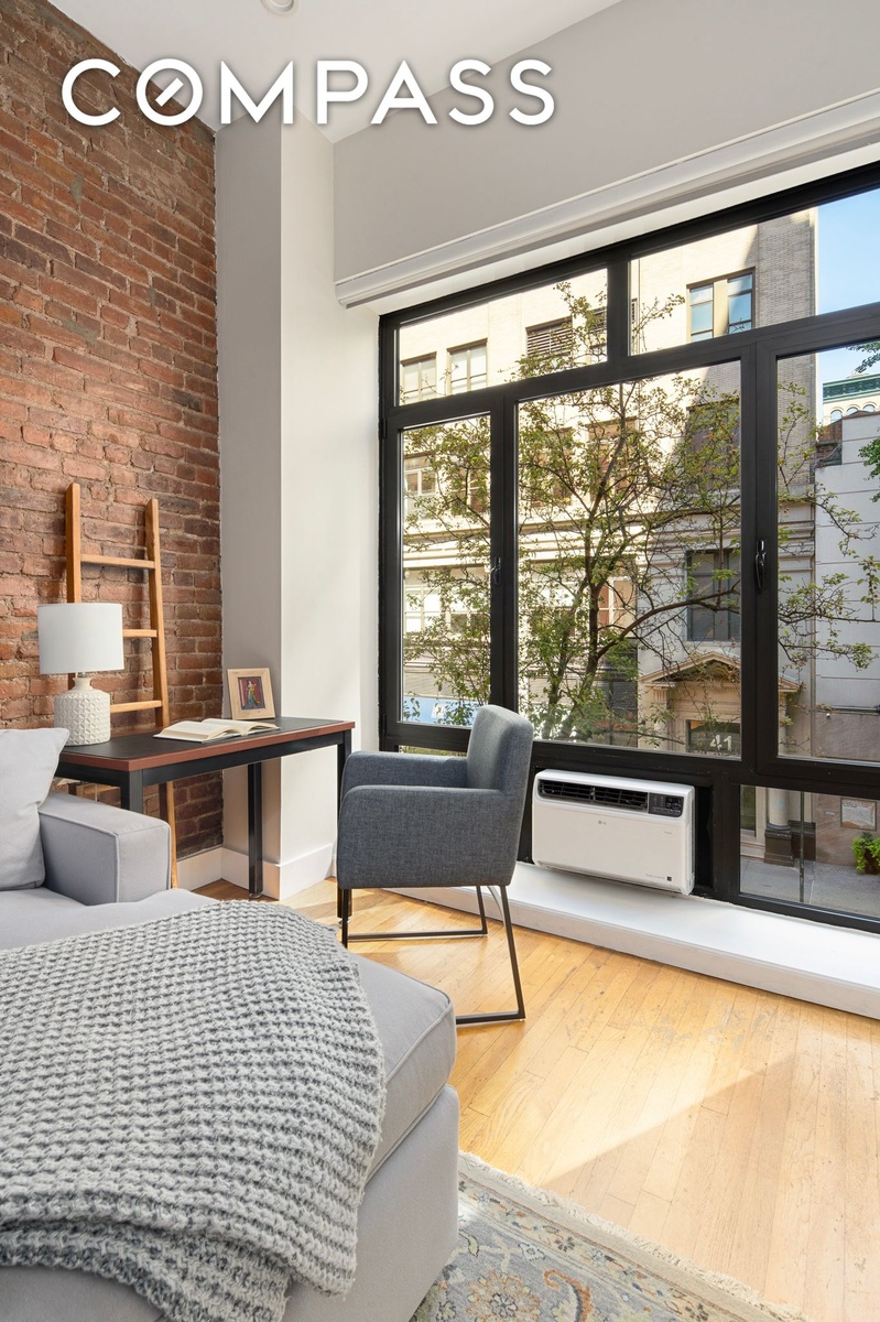 This Greenwich Village 1BR loft in a pre-war doorman building checks all the boxes of a classic downtown apartment. Exposed brick and an 8 foot wall of windows frame the view onto tree-lined 11th Street. The soaring 11 foot ceilings and large rooms create a true sense of volume.