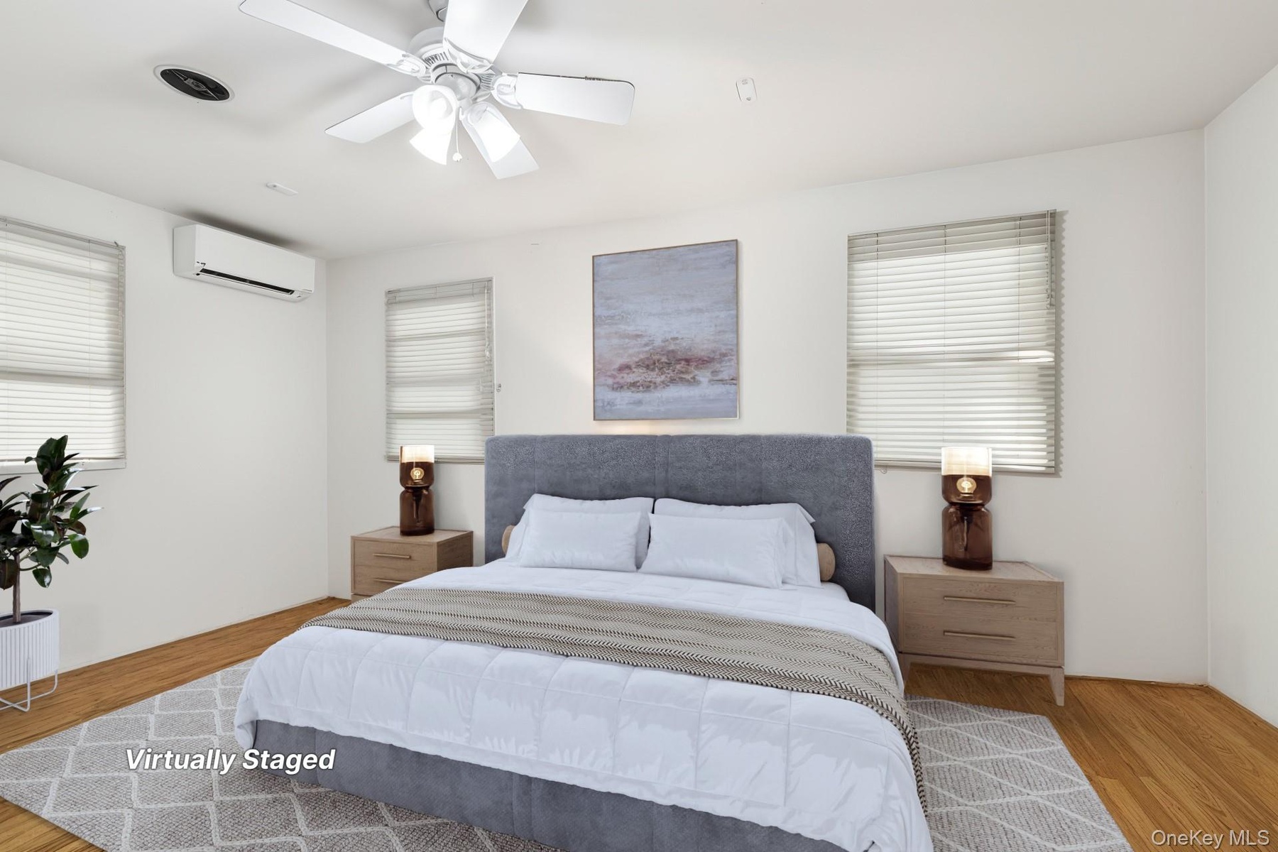 - Bedroom featuring wood finished floors, ceiling fan, and a wall mounted AC