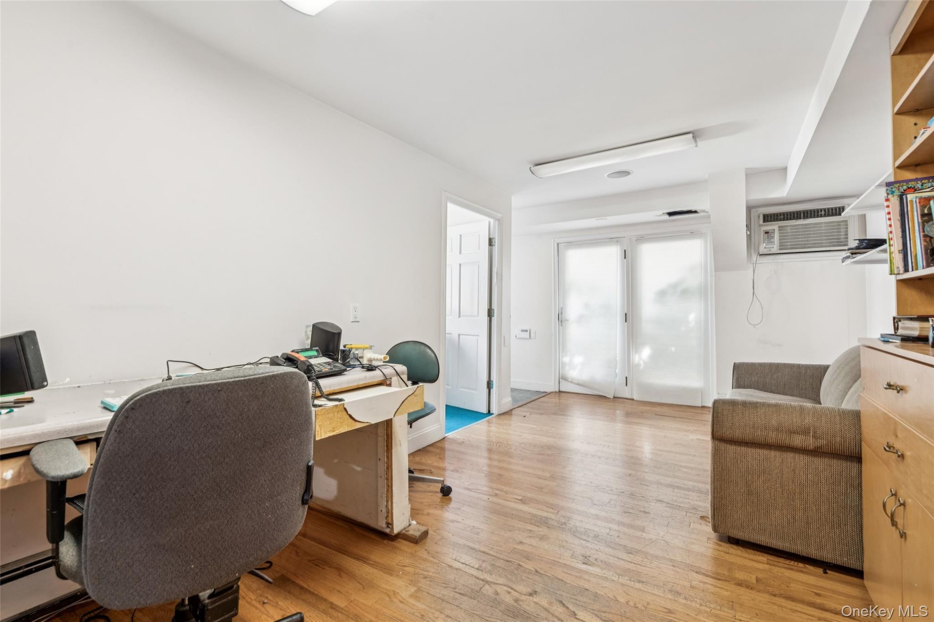 - Office with light wood-type flooring, baseboard heating, and a wall unit AC