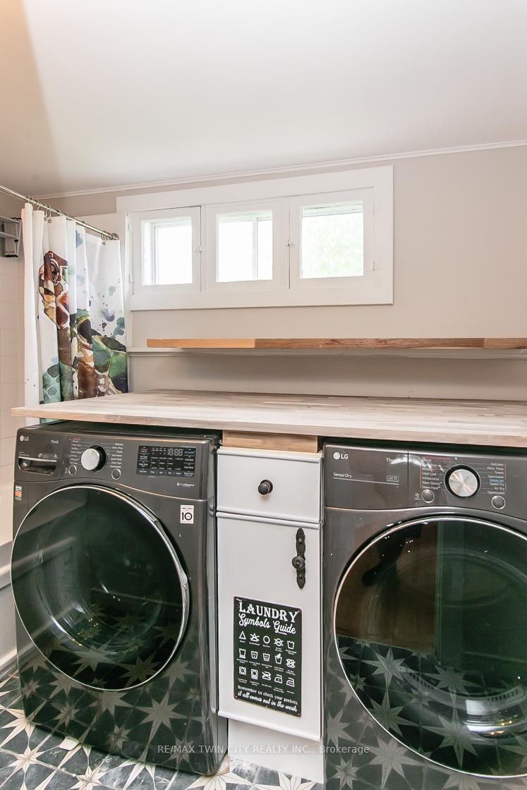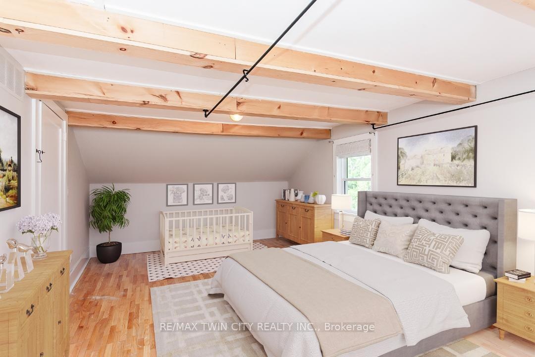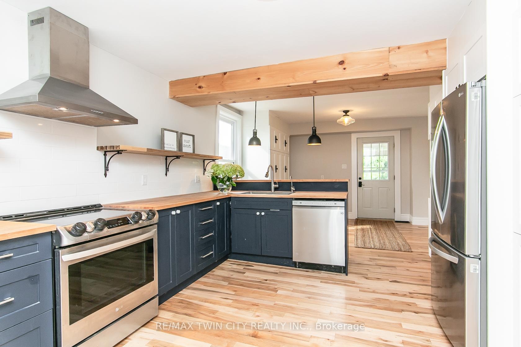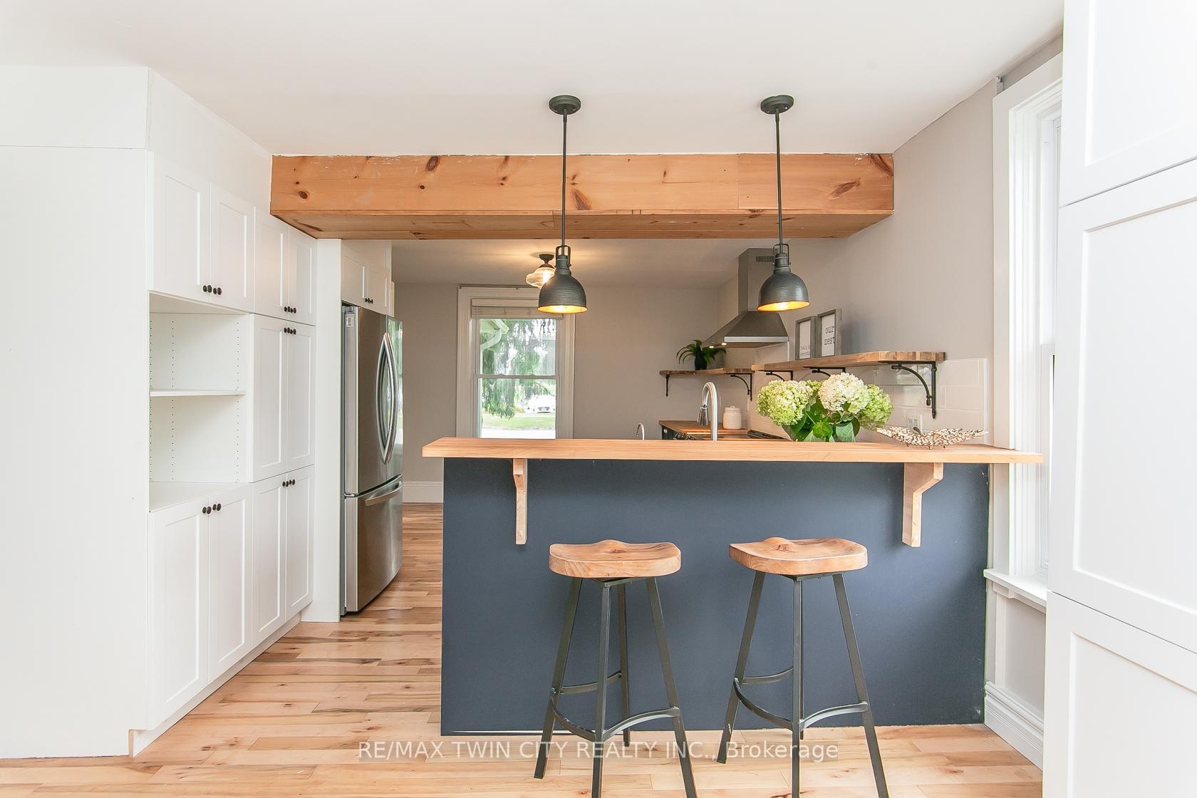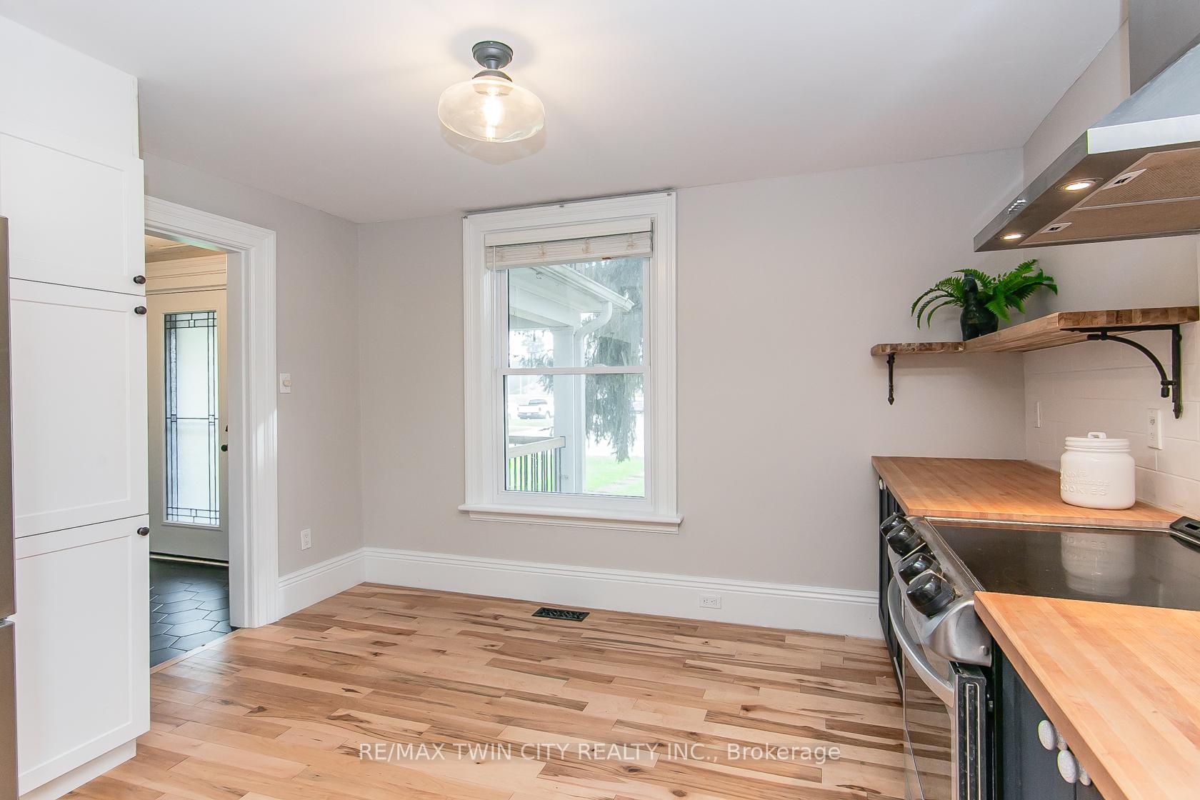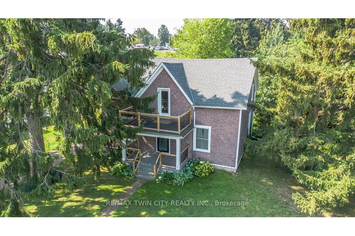 This beautifully restored Farmhouse seamlessly blends timeless character with modern upgrades. Set well off the road, on a generous 2/3 acre lot, the property offers privacy, space & incredible potential - all just minutes from amenities & 401 highway access. The heart of the home is the skillfully renovated kitchen, showcasing rich indigo cabinetry, maple counter tops, new SS appliances, floating shelves, and breakfast bar. With a raised sink and vintage tile, the spacious main floor powder room complements the farmhouse feel. The main living & dining areas showcase classic trim work, large new windows & garden doors that lead to the remodeled covered porch perfect for enjoying tranquil views of mature trees, lilacs, raspberry & mulberry bushes alongside frequent visits from birds & local wildlife. Upstairs, the expansive primary suite offers flexibility keep it as an impressive retreat, add a nursery or creative space, or easily convert the home back into a 3 bedroom layout. The breathtaking, spa-inspired bathroom features a freestanding soaker tub, large open walk-in shower, private water closet & ample storage. A conveniently located second floor laundry room comes complete with new appliances (a 2nd set in bsmt!) & a tub/shower combo for everyday conveniences. Step out onto the upper balcony to enjoy views of the park & nearby trails. Hardwood floors throughout and lighting fixtures thoughtfully chosen to complement the rustic charm. Freshly painted from trim to ceiling, this home is move-in ready! The expansive lot offers room to dream consider adding a pool, workshop, or exploring the possibility of a secondary dwelling unit, with ample parking for 4+ vehicles & a detached garage. Ideally located across from the community center (with pool!) and no back neighbours! This is more than a home its a lifestyle! Come experience the perfect blend of City conveniences and country charm. Dont miss the chance to make it yours!