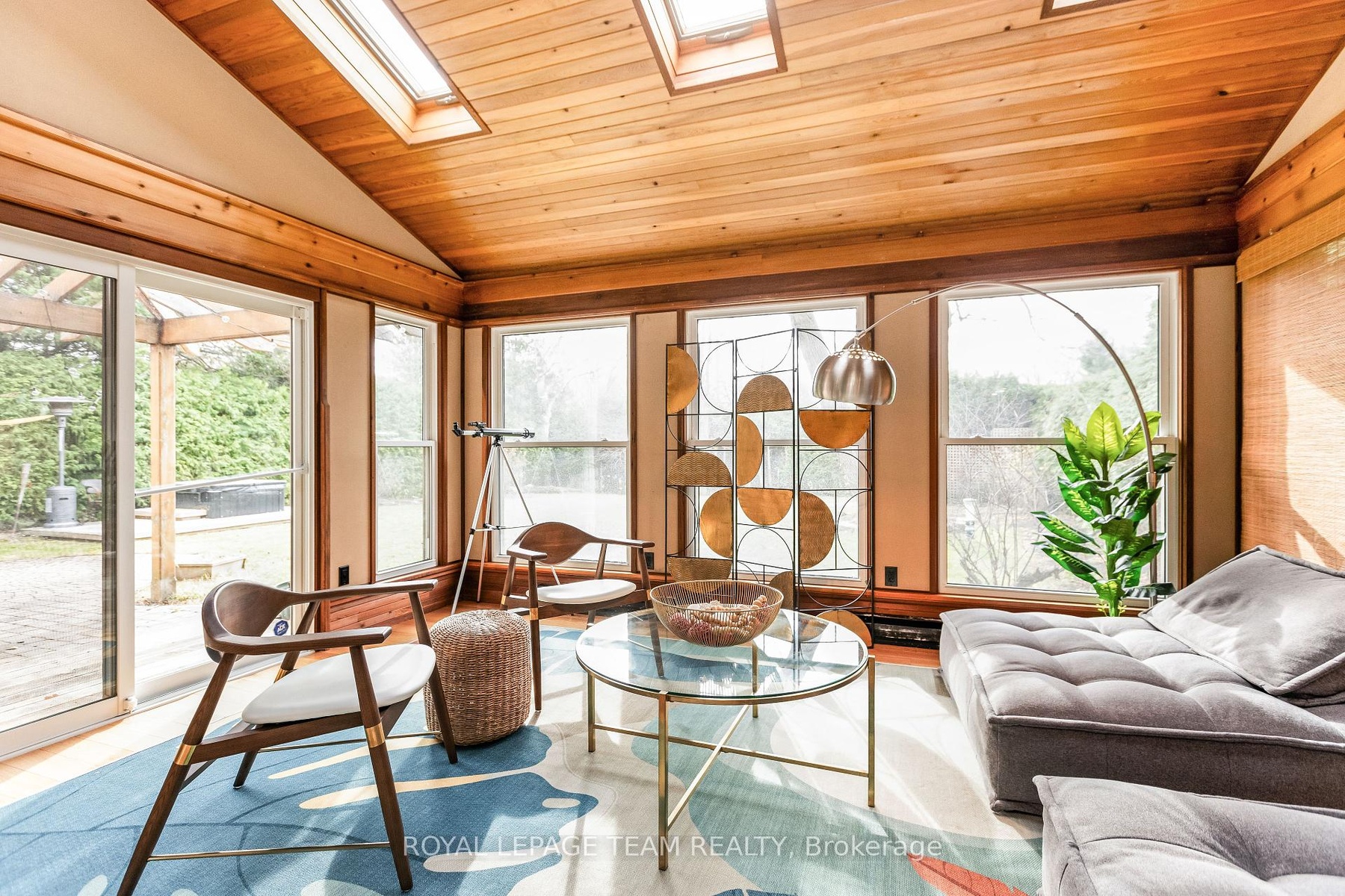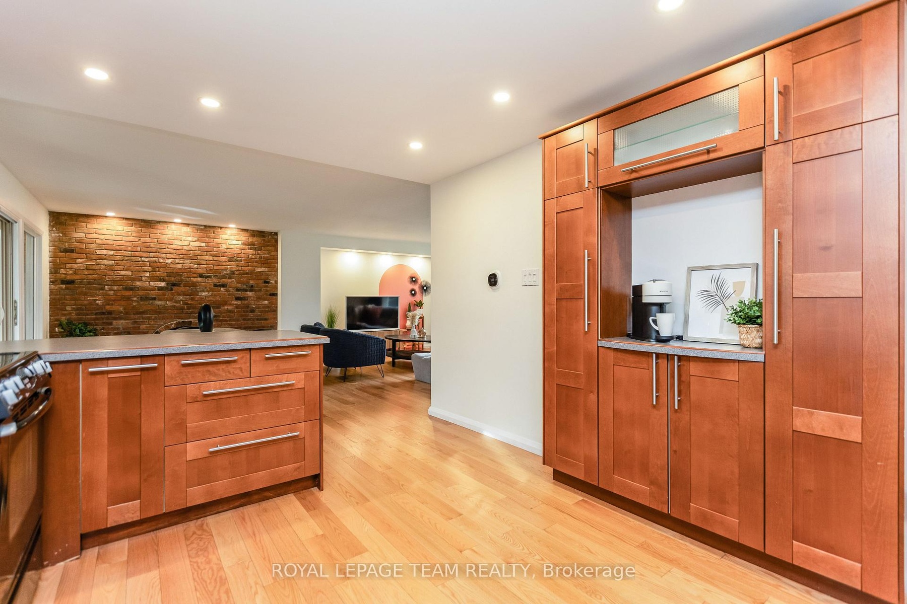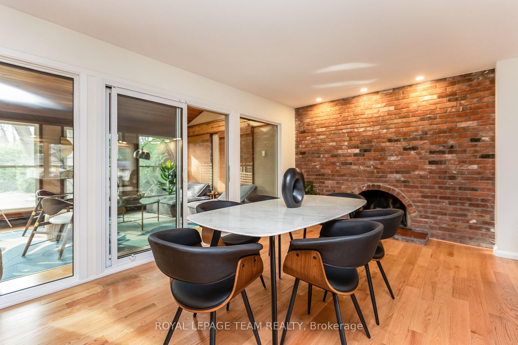No rear neighbors! This striking mid-century modern 4-bed, 3-bath home sits on a quiet street in prestigious Beaverbrook, with an oversized lot that feels like your own private retreat. Extensively renovated throughout including flush beam installed creating open concept main floor living, it blends timeless design with contemporary updates. The open-concept main floor features clean lines, oversized windows, and a striking brick feature wall with a cozy wood-burning fireplace. A true highlight is the 4-season solarium with vaulted ceilings and skylights - perfect for soaking in views of the private backyard oasis year-round. A sunny flex room on the main level offers the ideal spot for a home office or dining room. Recent updates include the kitchen, three bathrooms, banister and iron railings, hardwood flooring, lighting, and wiring. Upstairs, the primary suite boasts a custom walk-through closet and sleek 3-pc ensuite. The finished basement extends the living space with a playroom and family room. Step outside to enjoy a spacious patio with pergola, hot tub, and mature landscaping - all with no rear neighbors. Close to parks, trails, and everyday amenities, this home offers the rare combination of privacy, style, and convenience. An iconically Canadian gem in the heart of Beaverbrook!