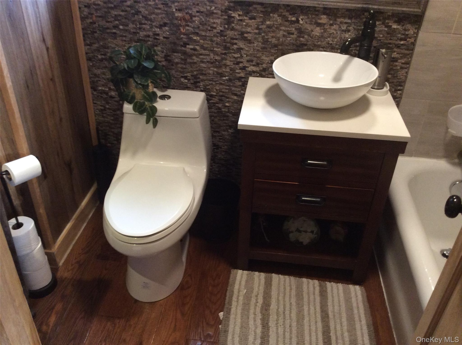 - Bathroom with vanity, dark wood-style flooring, and a bath