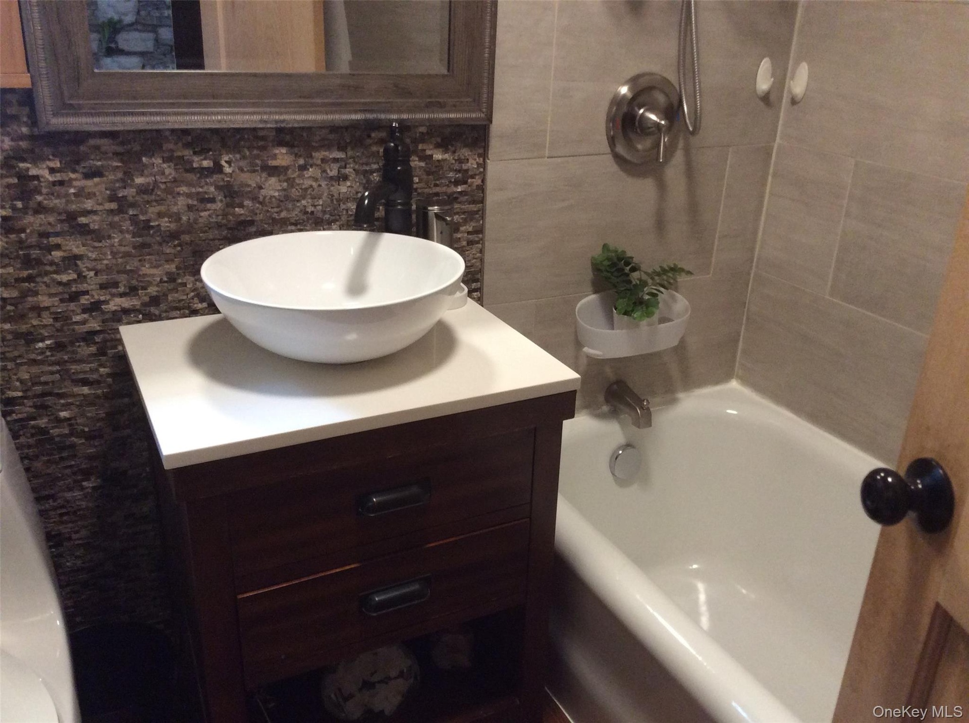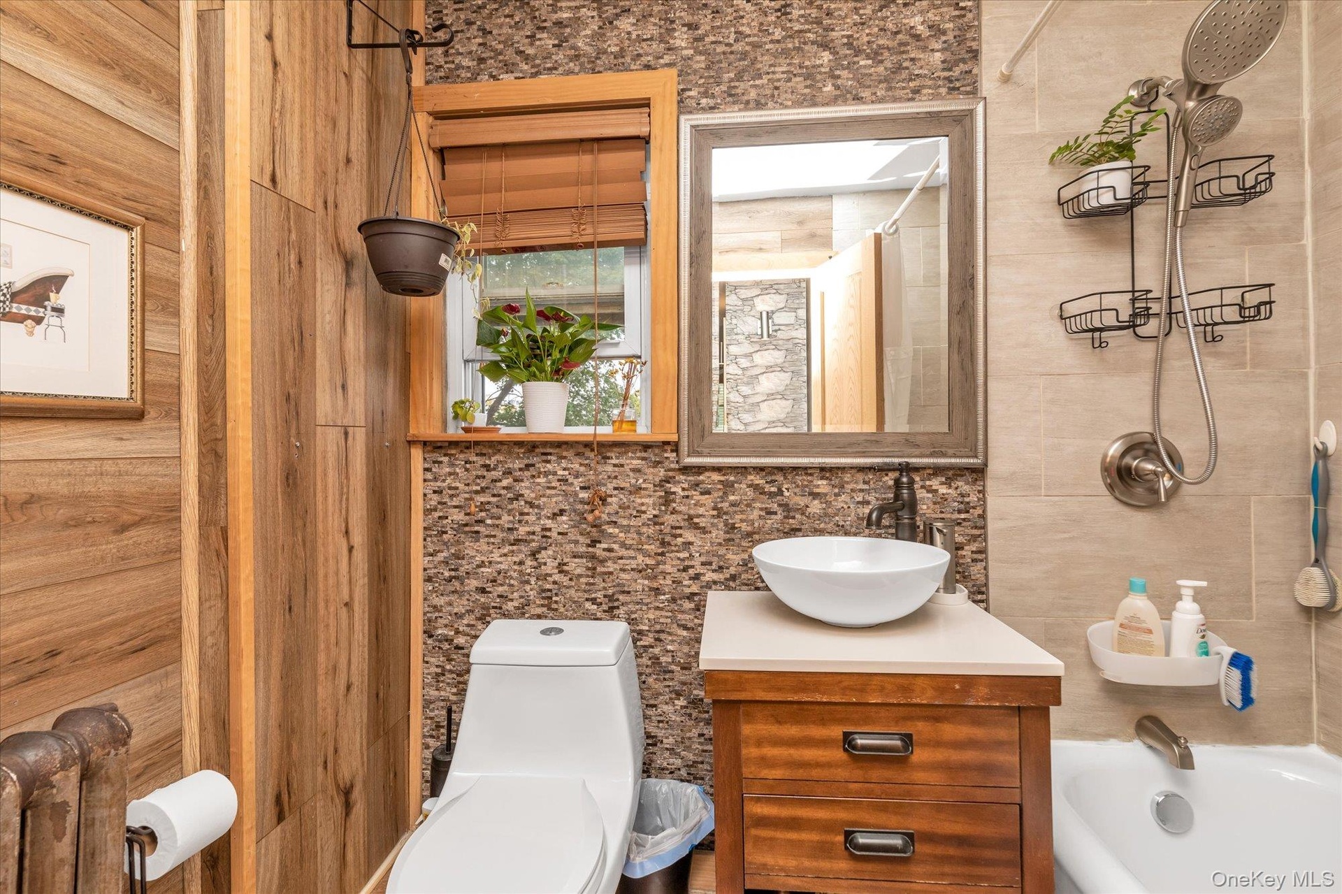 - Bathroom featuring shower / bathtub combination, vanity, tasteful backsplash, tile walls, and radiator heating unit